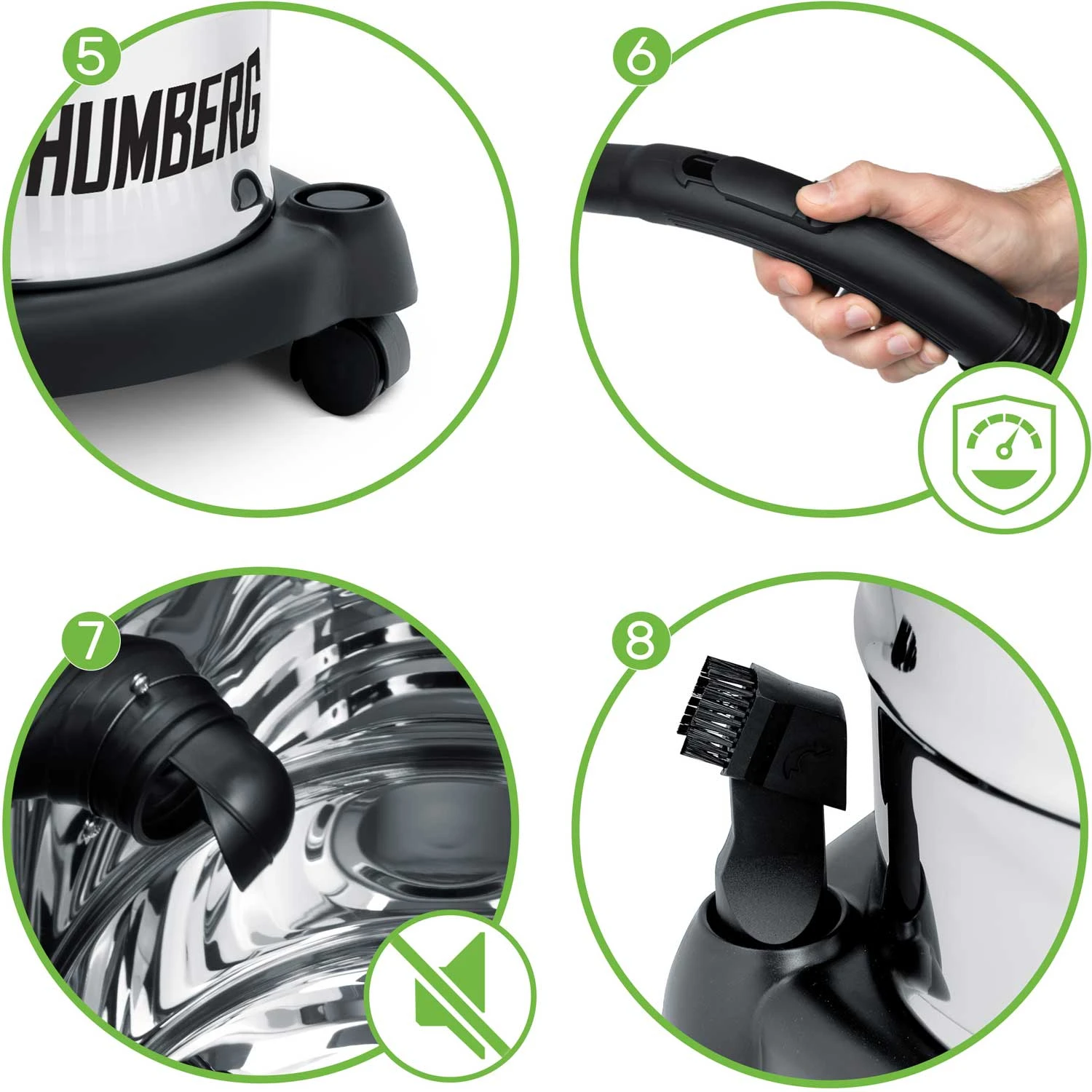 1. Ima funkcijo pihanja , ki omogoča enostavno čiščenje listja z dovoza ali pometanje peska s hodnika. 2. Sesalnik se odlično spopade s pepelom, umazanijo, odpadki, ostanki mavčnih plošč, kovinskimi in lesnimi ostružki. 3. Enostavno upravljanje z enim gumbom. 4. Trpežne kovinske kljuke , ki se ne bodo zlomile niti pri največji obremenitvi. Sesalnik je opremljen z veliko 20-litrsko posodo.