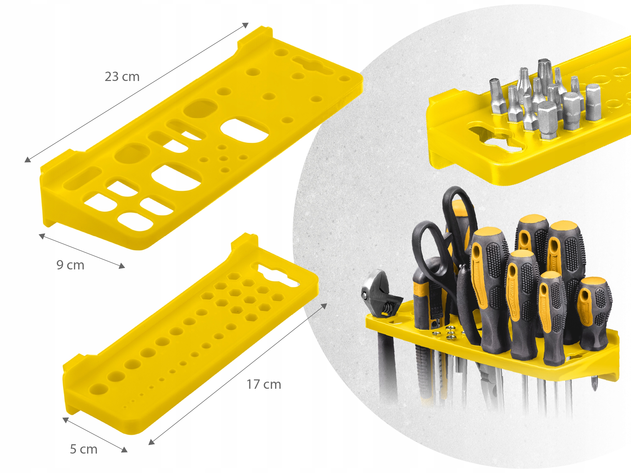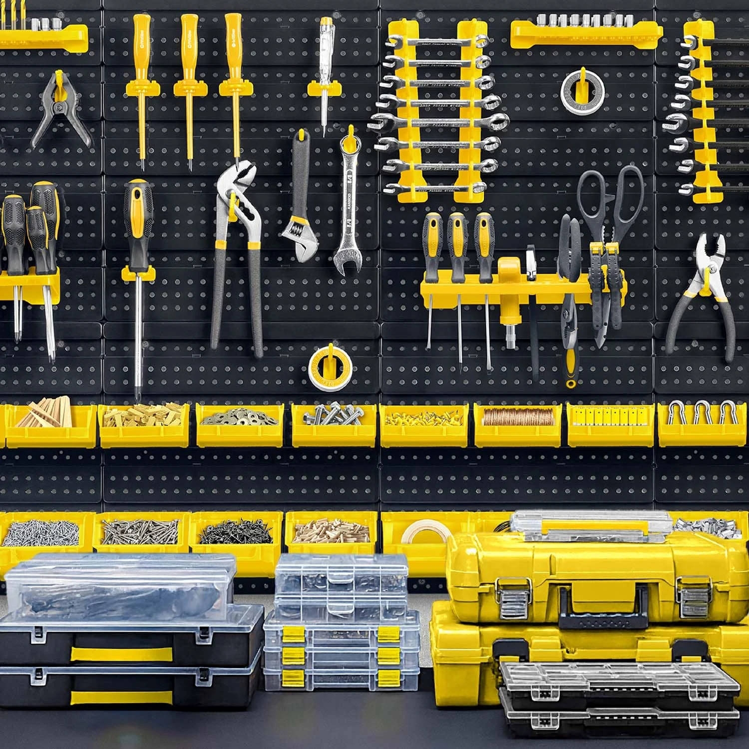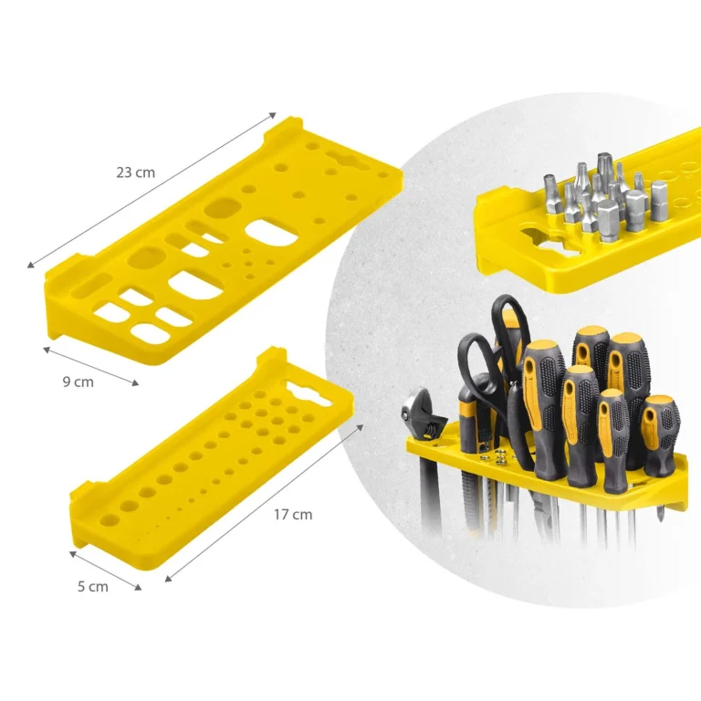 - Držala in kavlji omogočajo obešanje orodja, kot so klešče, kladiva ali izvijači, s čimer ohranjate urejenost svoje delavnice.