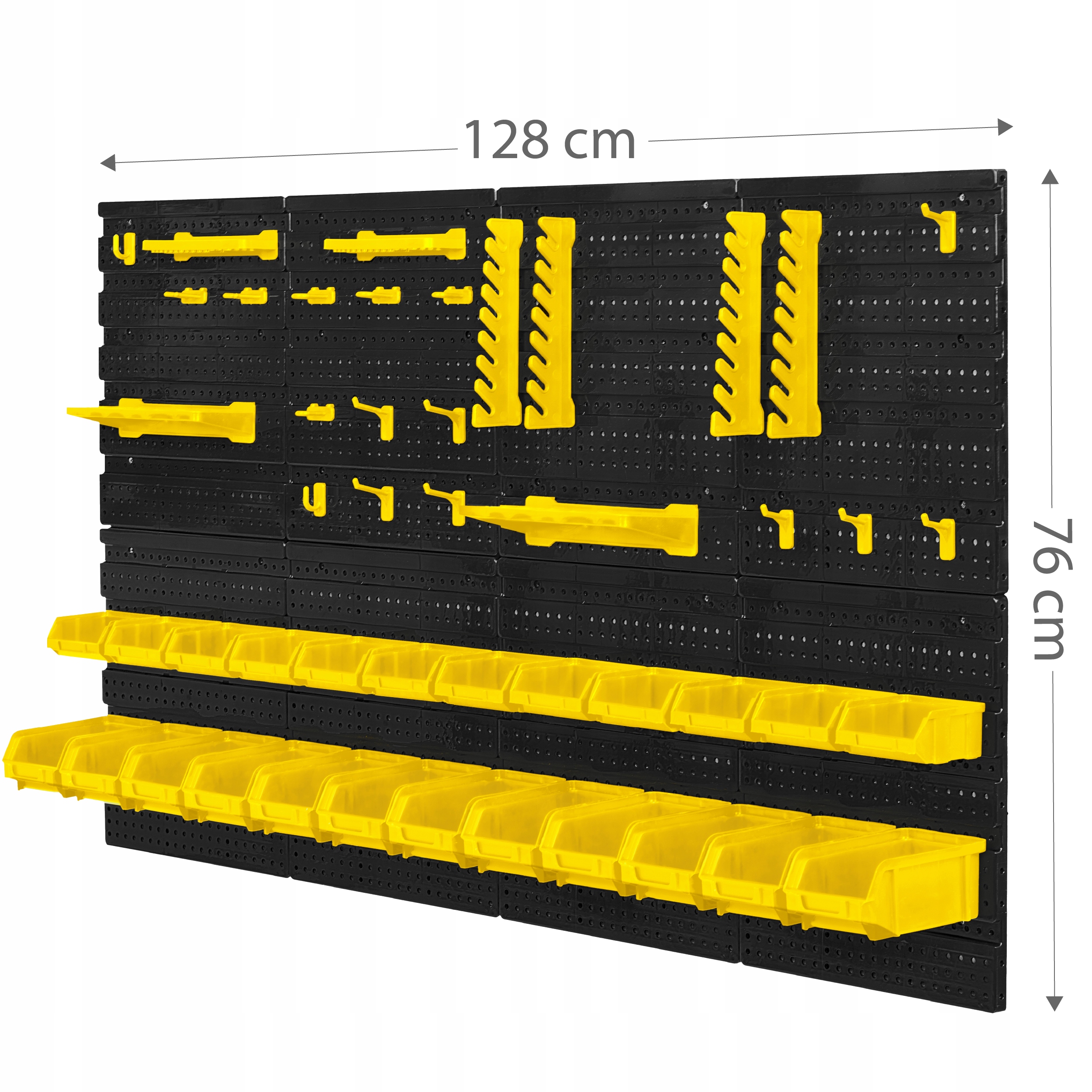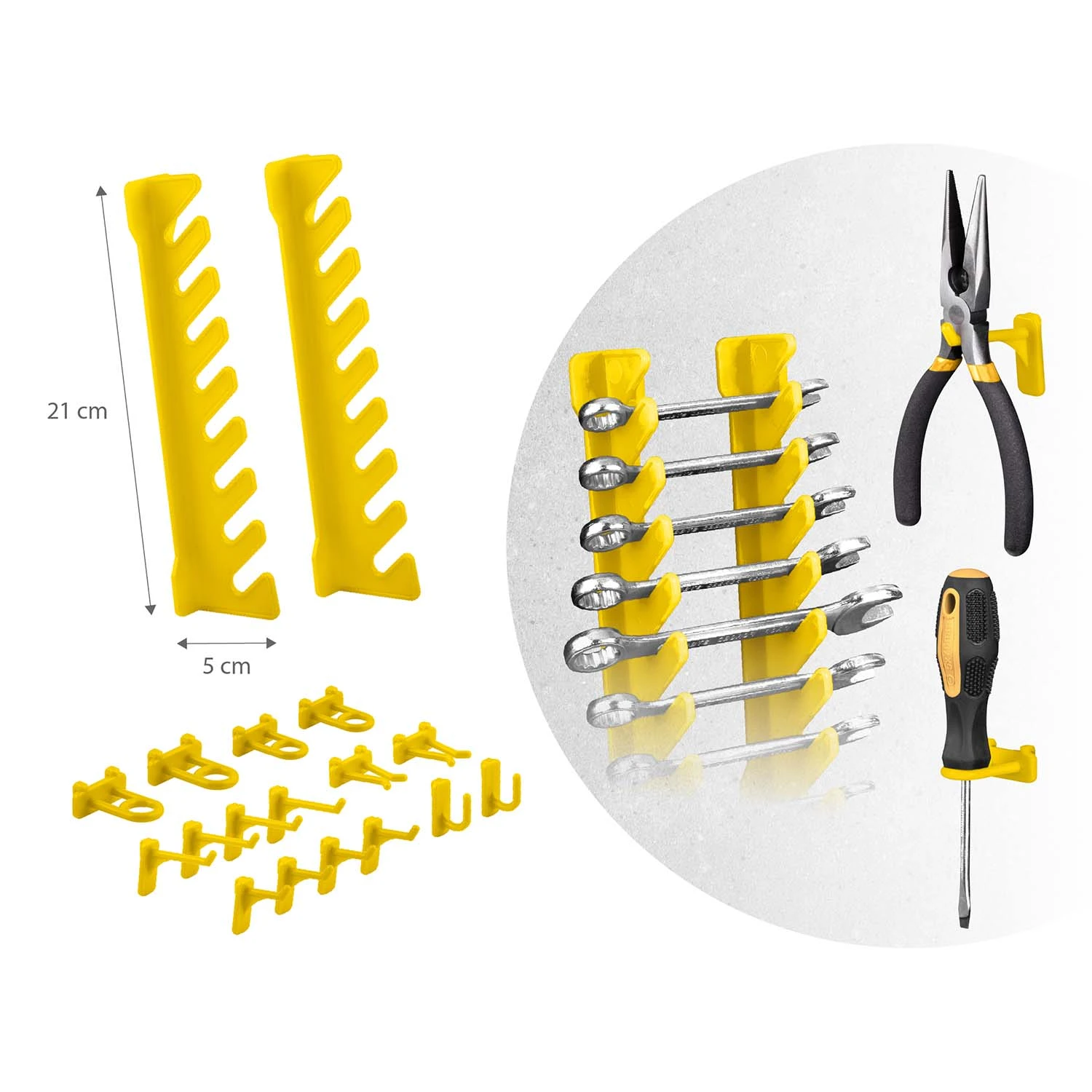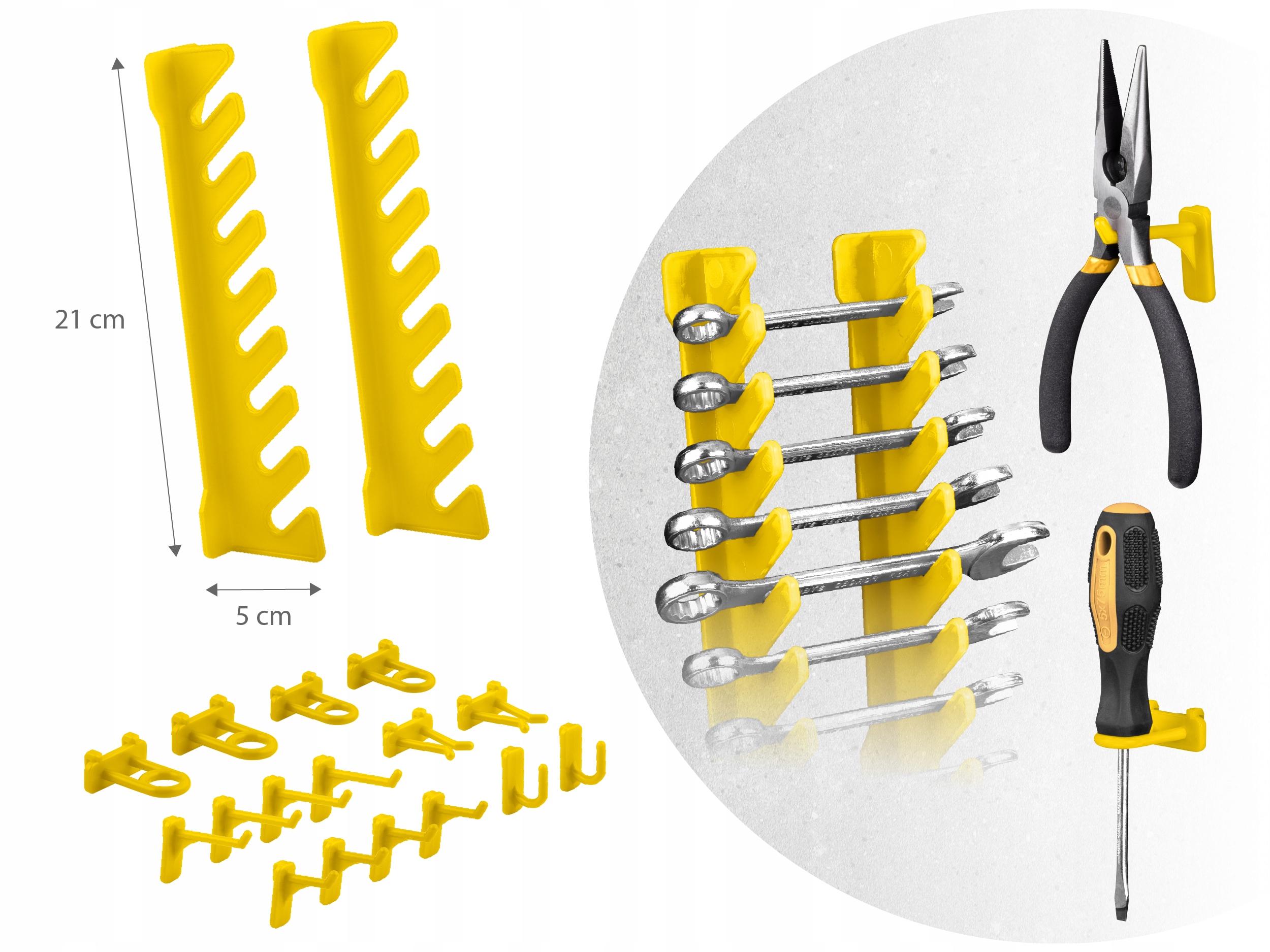 - Držala in kavlji omogočajo obešanje orodja, kot so klešče, kladiva ali izvijači, s čimer ohranjate urejenost svoje delavnice.