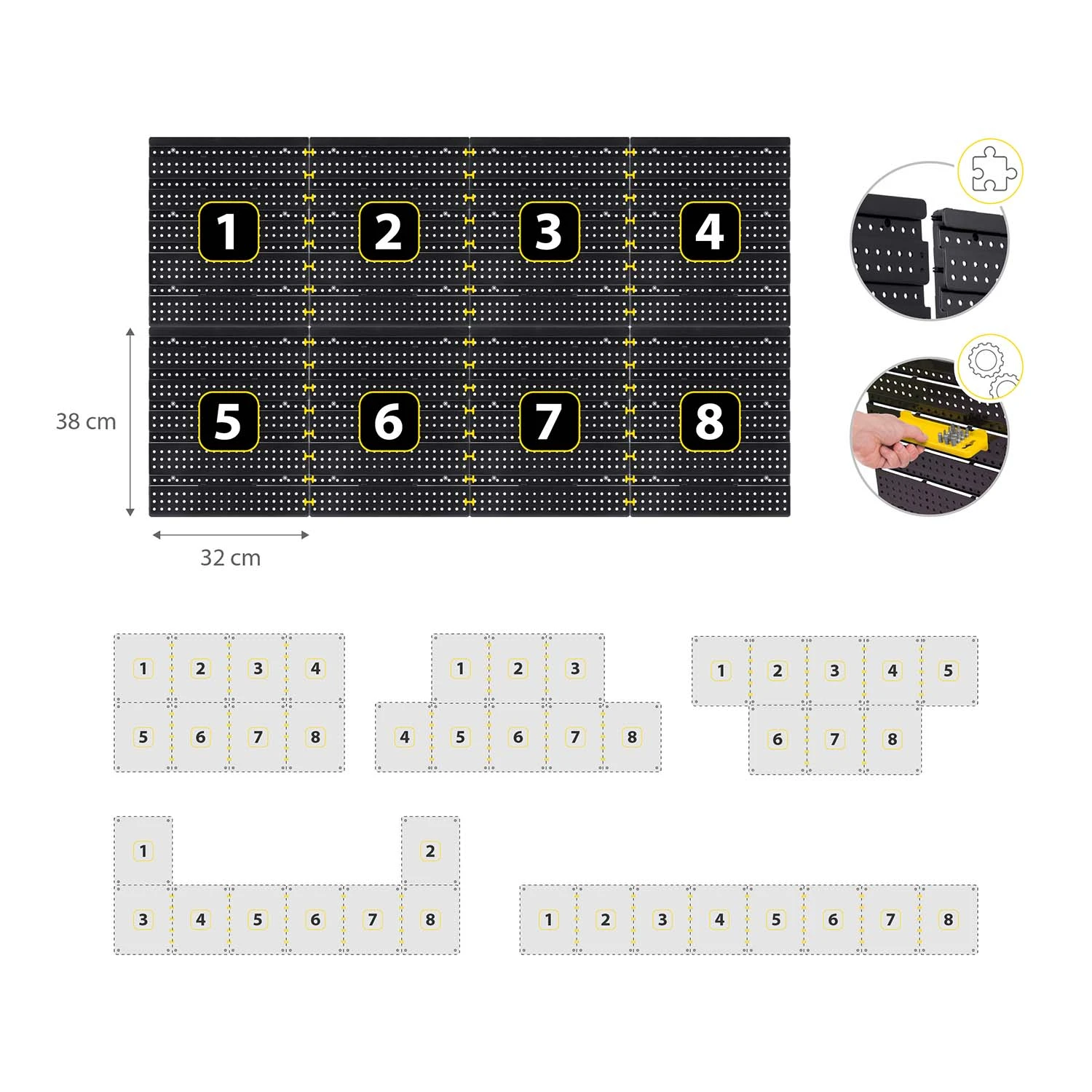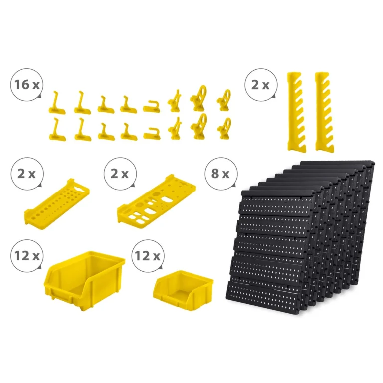 Orodna plošča ima modularno zasnovo, ki vam omogoča prosto kombiniranje plošč in prilagajanje postavitve vašim potrebam. Preprosta montaža omogoča hitro in enostavno povezovanje posameznih elementov, različne kombinacije pa zagotavljajo fleksibilnost pri organizaciji delovnega prostora. Prilagodite ploščo svojim potrebam in ustvarite popoln red v svoji delavnici!