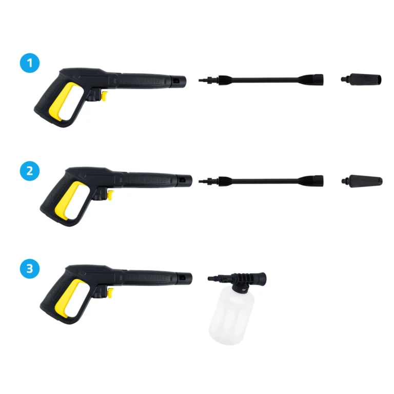 Šoba s funkcijo StopAndSafe™ – zahvaljujoč mehanizmu za samodejno sprostitev in zaklepu sprožilca ne boste le prihranili vode, temveč boste uživali v varni uporabi , tudi ko ste obkroženi z otroki, ki tekajo po vrtu. Priložena turbo šoba tehnologija TurboStream™ zagotavlja izjemno moč čiščenja s koncentriranim visokotlačnim vodnim curkom, ki učinkovito odstrani tudi najbolj trdovratno umazanijo. Nastavljiva steklenička za detergent s prostornino 450 ml – samodejno doziranje kemikalij za temeljitejše in priročnejše pranje!
