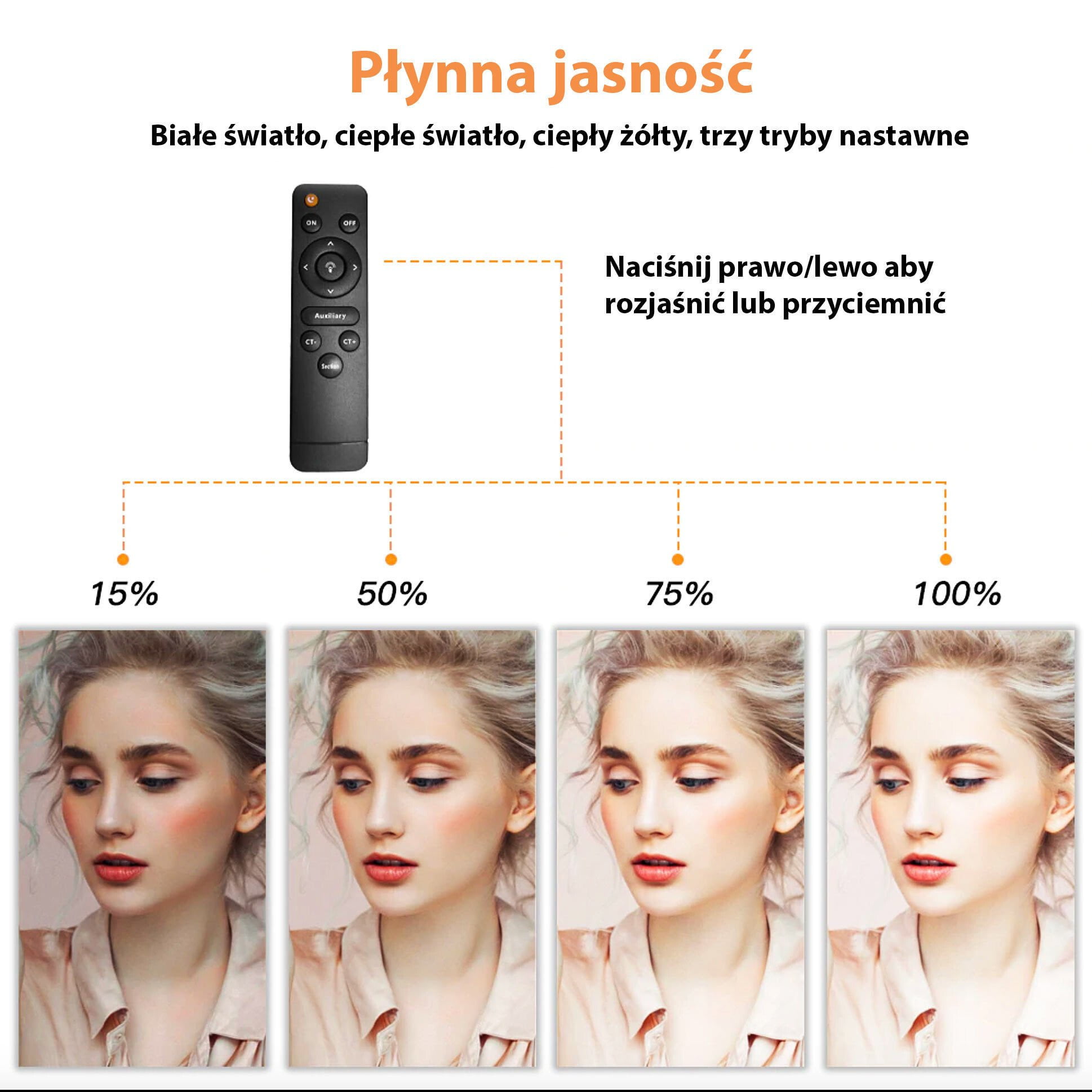 * Barvno temperaturo je mogoče nastaviti od 3500K do 5600K, prosto prilagajanje barve in svetlosti * 3 barvni načini osvetlitve: bela, rumena + bela, rumena * 220 inovativnih SMD LED diod, visokokakovosten ABS pokrov luči, zagotavlja mehko in naravno svetlobo, okolju prijazna svetilka (zelo nizka poraba energije)