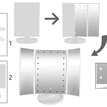 - 3 STOPNJE BLIŽINE – odpiralno ogledalo ima dve stranski ogledali, na levi strani imamo običajno ogledalo brez povečave, medtem ko sta na desni strani dvojna in trojna povečava. Povečava je v veliko pomoč pri nanašanju ličil ali operaciji. Ni se nam treba približati ogledalu, da bi ustvarili popolnoma enakomerno črto nad očmi, dovolj je, da pogledamo v stransko ogledalo in se naličimo.