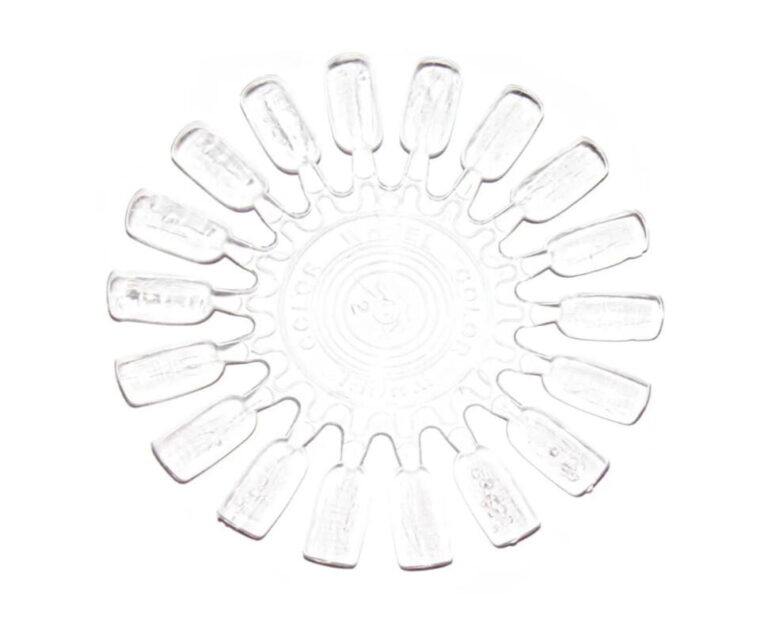 Prozorna paleta za predstavitev barv lakov za nohte in gelov. Šablona omogoča predstavitev 18 barv. Šablona je izdelana iz trpežne plastike.