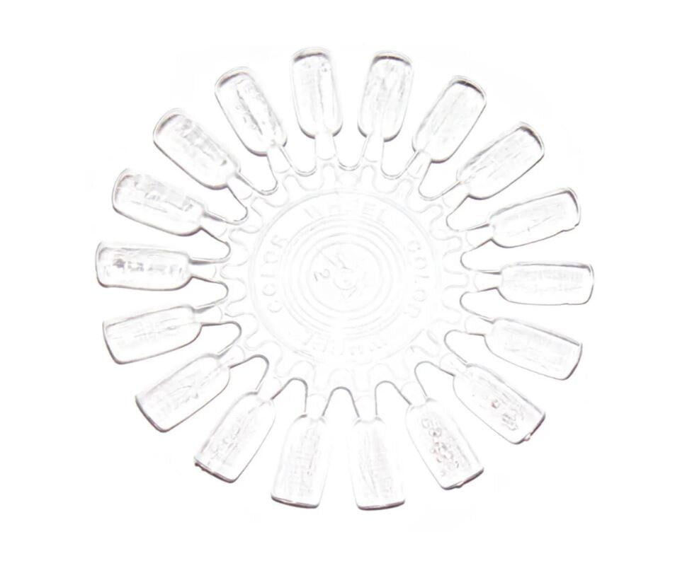 Prozorna paleta za predstavitev barv lakov za nohte in gelov. Šablona omogoča predstavitev 18 barv. Šablona je izdelana iz trpežne plastike.