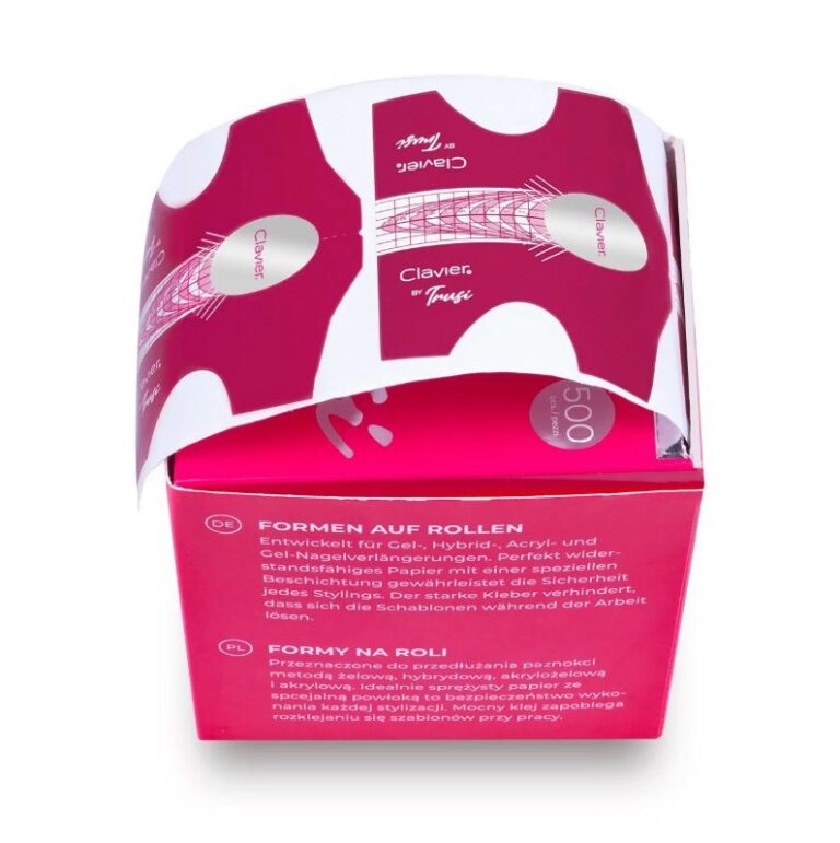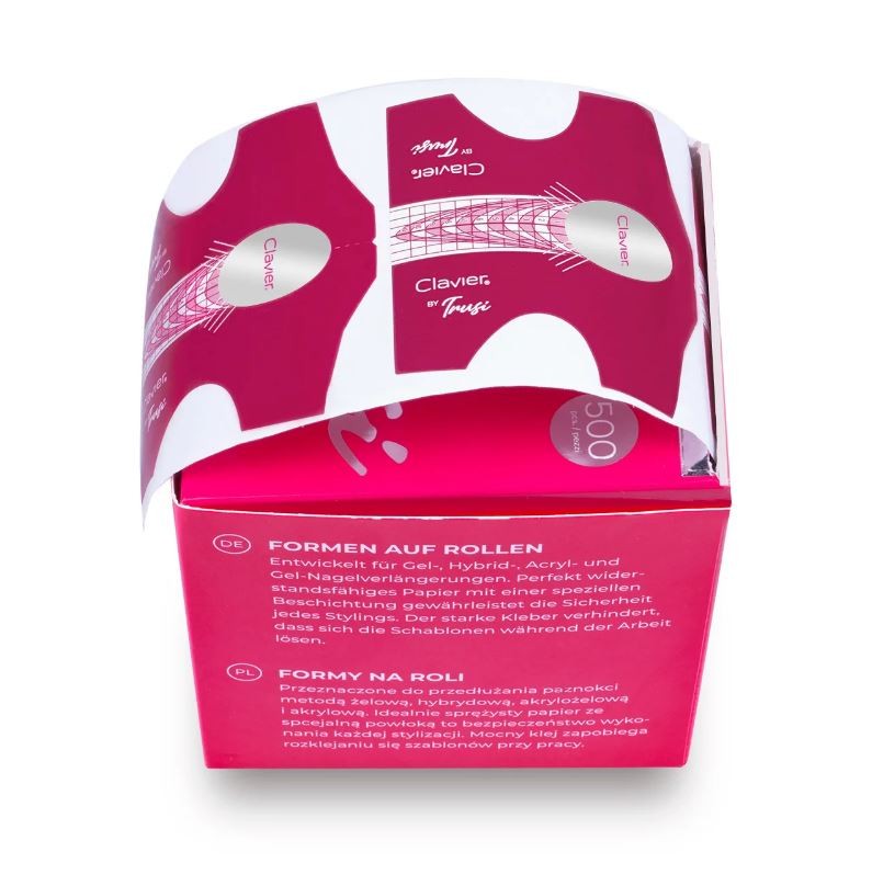 Profesionalne papirnate šablone Trusi znamke Clavier za podaljševanje naravnih nohtov! Samolepilne šablone za modeliranje lahko uporabite za podaljševanje naravnih nohtov z gel lakom, gelom, akrilnim gelom ali akrilom. Te visokokakovostne profesionalne šablone imajo dobro stabilnost in odlično lepilno moč. Kljub temu so dovolj fleksibilne, da omogočajo enostavno modeliranje. Paket vsebuje 500 kosov, šablone pa so pakirane v škatli.