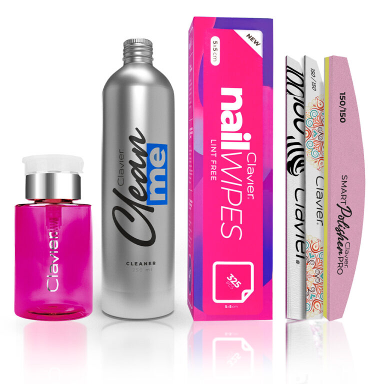 Čistilo “Clean Me” učinkovito odstrani vse nečistoče z nohtne plošče in jo pripravi na nadaljnje tretmaje. Vatirane blazinice Nail Wipes, ki ne puščajo vlaken, so idealne za natančno čiščenje obnohtne kožice in odstranjevanje ostankov laka za nohte. Dozirnik s črpalko zagotavlja praktično in higiensko doziranje tekočine. Tri pilice za nohte z ustrezno gradacijo vam bodo omogočile, da boste svojim nohtom dali popolno obliko.