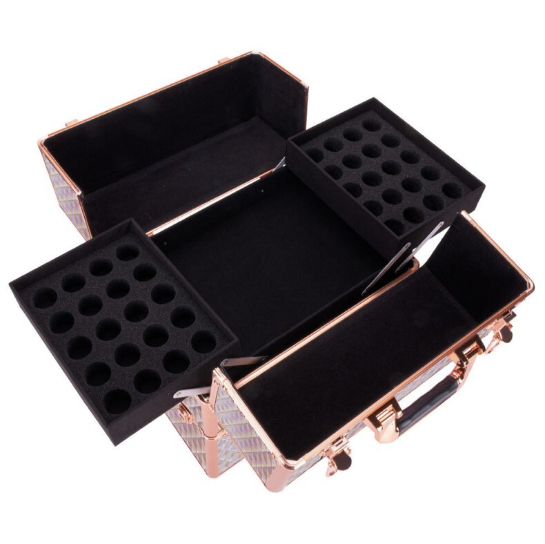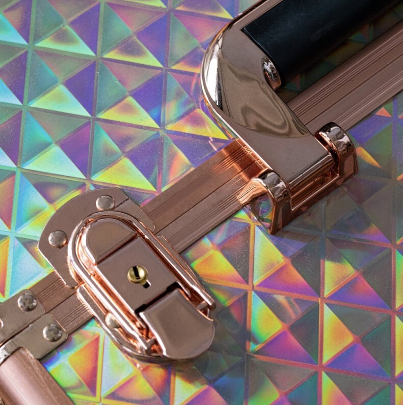 DIAMOND XXL kozmetična/make-up torbica (roza zlato) – je praktična, robustna aluminijasta torba/kovček za organizirano shranjevanje in prenašanje lepotnih pripomočkov. Večji XXL format je še posebej primeren za stvari, kot so UV/LED svetilke za nohte , električne pilice (frezkarji) in drugi kozmetični izdelki in dodatki, tako da imate vse na enem mestu.