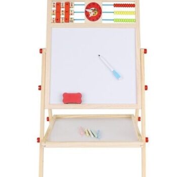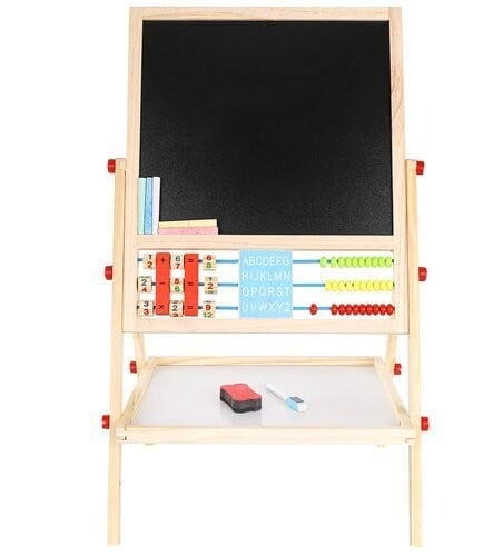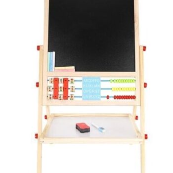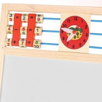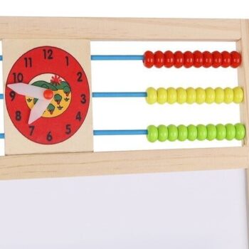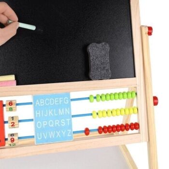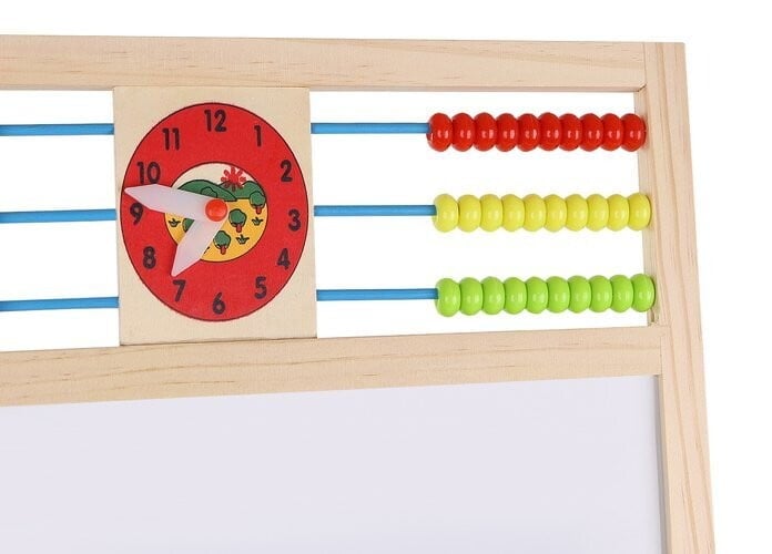• 1 TABLICA = 6 FUNKCIJ – dvostranska tabla za do 6 različnih uporab. Omogoča otroku pisanje s kredo po črni strani table in risanje z belim svinčnikom po beli strani. Tabla ima tudi klasičen abakus s perlicami , s katerim se bo otrok podal na pustolovščino štetja. Nato se lahko nauči osnovnih matematičnih operacij, kot so seštevanje, odštevanje in množenje. Otrok se bo ukvarjal tudi z uro, na kateri bo lahko prosto nastavljal čas z rokami; naučil se bo prepoznavati čas. Tabla ima tudi abecedo , ki bo vašemu otroku omogočila, da se nauči prvih črk, ki bodo kasneje ustvarile prve besede.