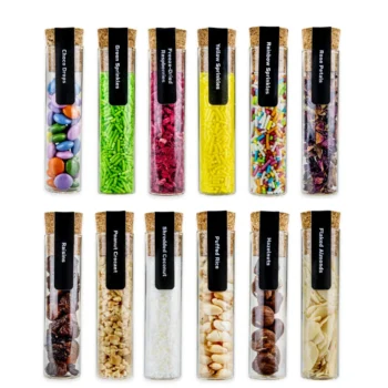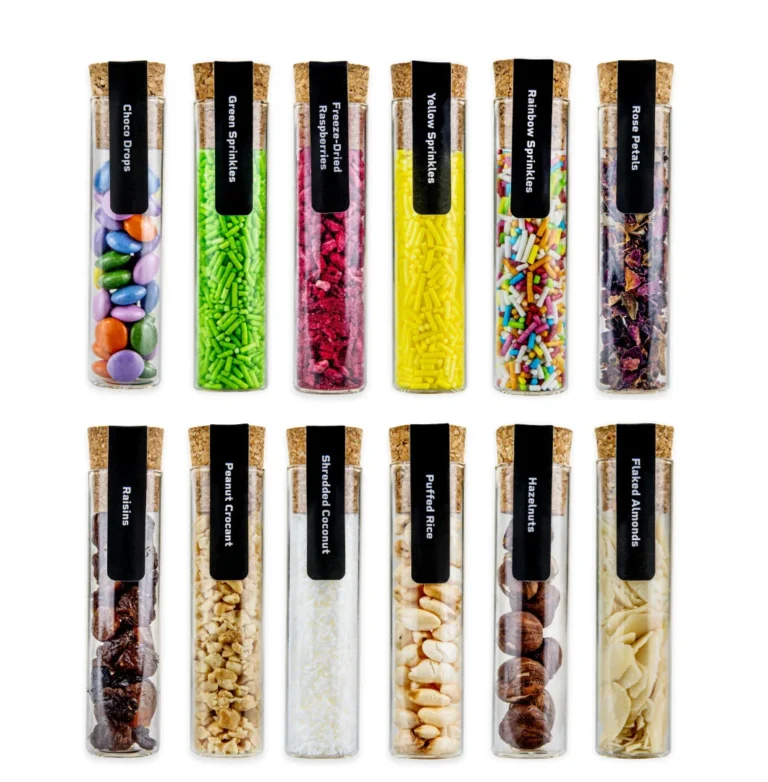 12 dodatkov za personalizacijo : liofilizirana jabolka, ananas, pomaranče, češnje, maline, fige, cvetni listi vrtnic , pisane drobtine, rozine , čili niti , hrustljavi arašidi , lešniki .