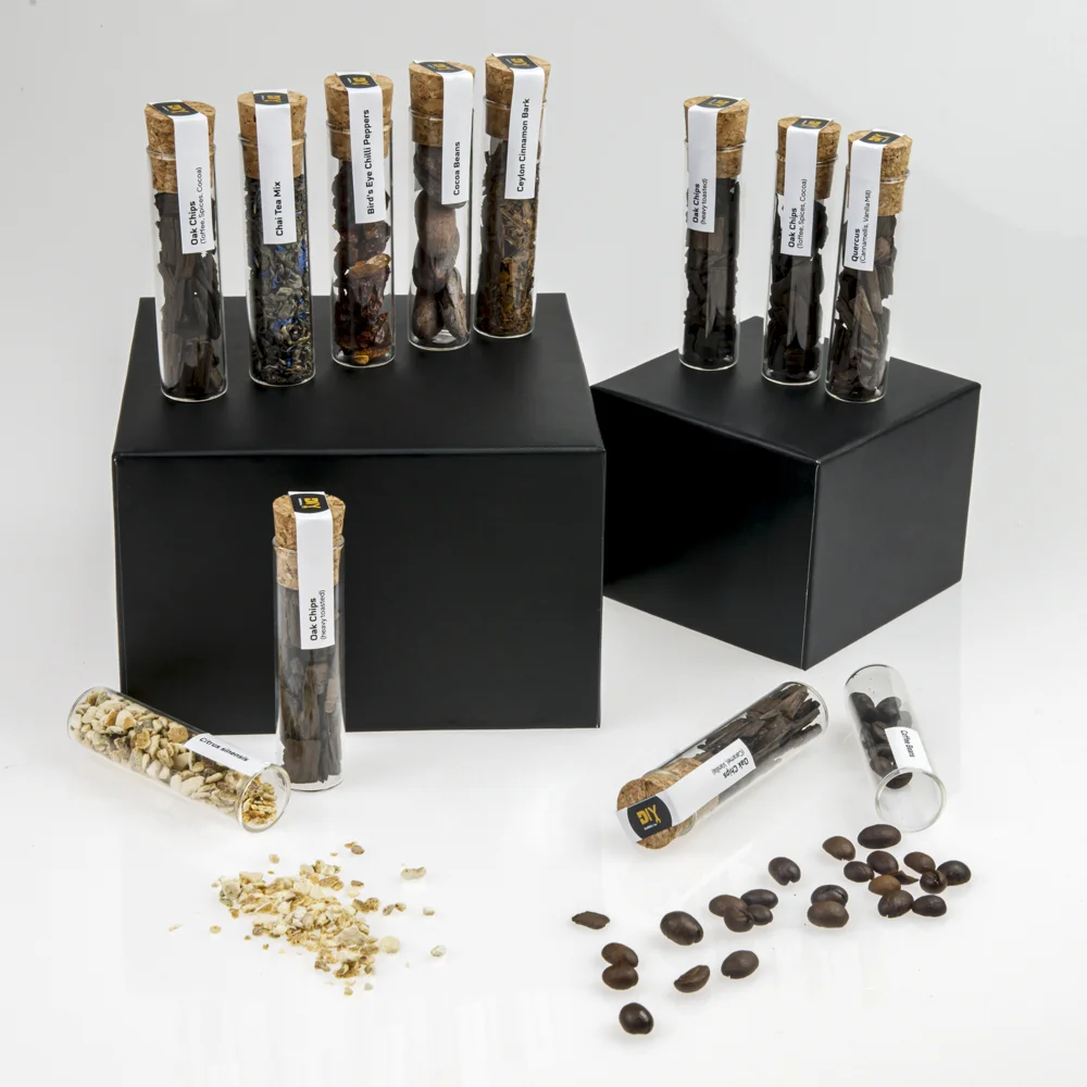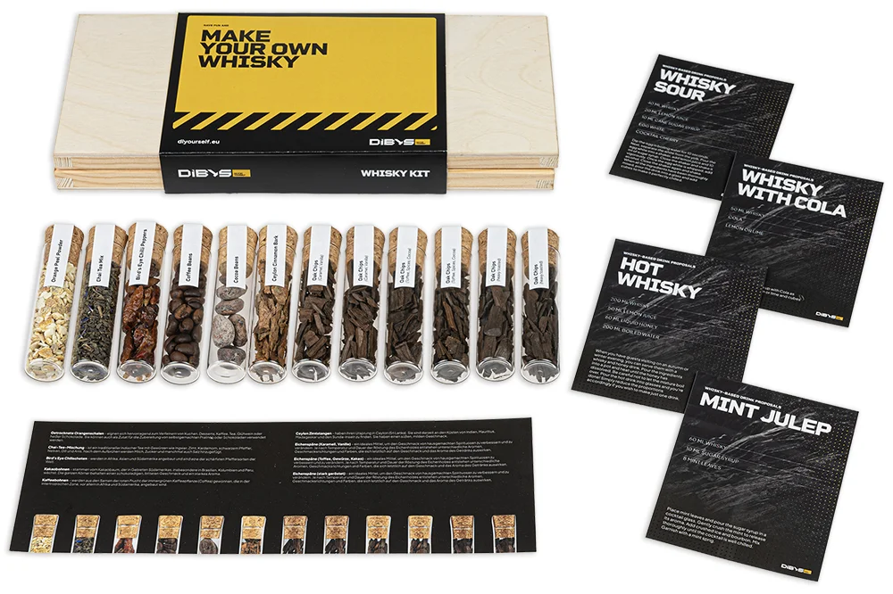 V svoj kozarec vnesite »dušo soda«! Ta mini set vsebuje skrbno izbrane arome in lesne elemente v 12 stekleničkah, ki aromatizirajo legalno kupljeno osnovo (npr. vodko/nevtralni alkohol) v profil, ki ga navdihuje viski: note hrasta, vanilije, karamele in začimb . Idealno za darila, domače degustacije in kreativne mešanice.
