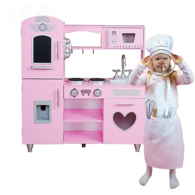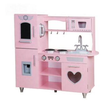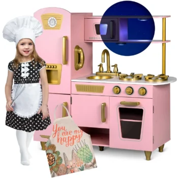 Uporaba najboljših surovin za izdelavo kuhinje pomeni, da bo zdržala vrsto let . Debela plošča in noge so izdelane iz masivnega lesa . Preostali elementi so izdelani iz MDF-ja . Kuhinja je opremljena z vsem, kar potrebujete , vključno s premično pipo, pomivalnim koritom, policami, omarico, kliki, uro, mikrovalovno pečico in pralnim strojem z odpiralnimi vrati. Vsi leseni elementi so brez nevarnih robov.