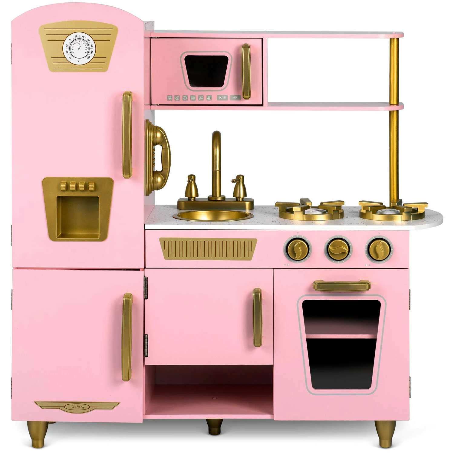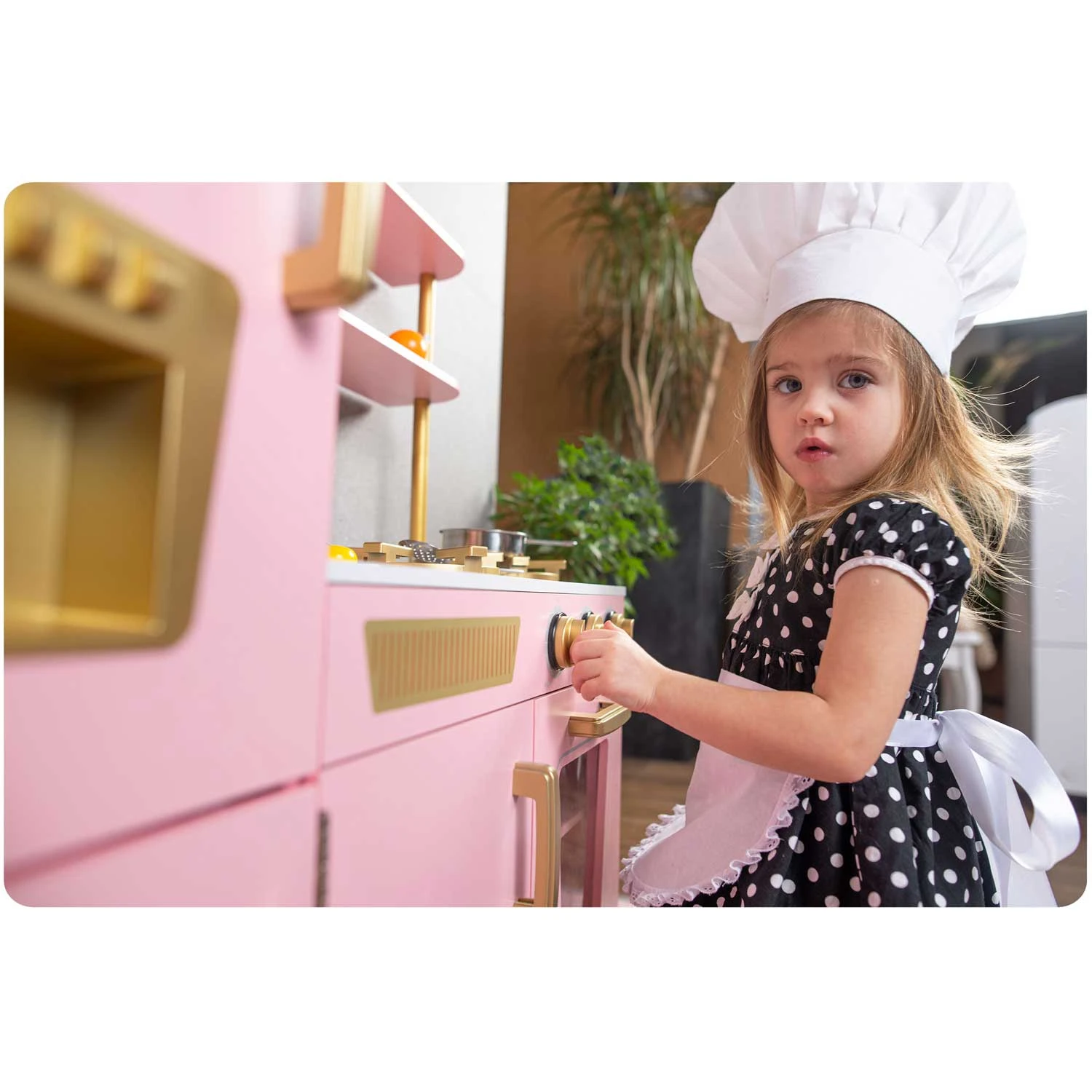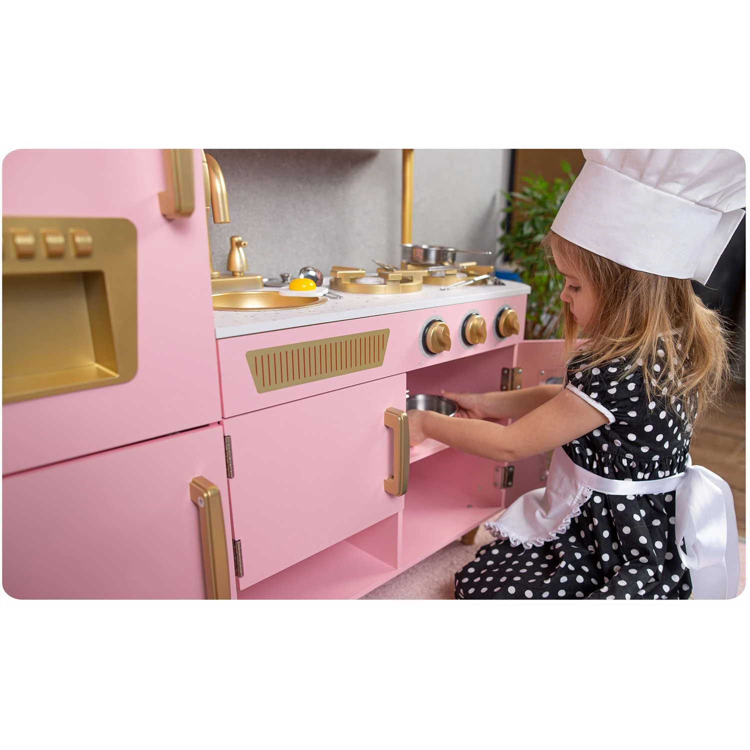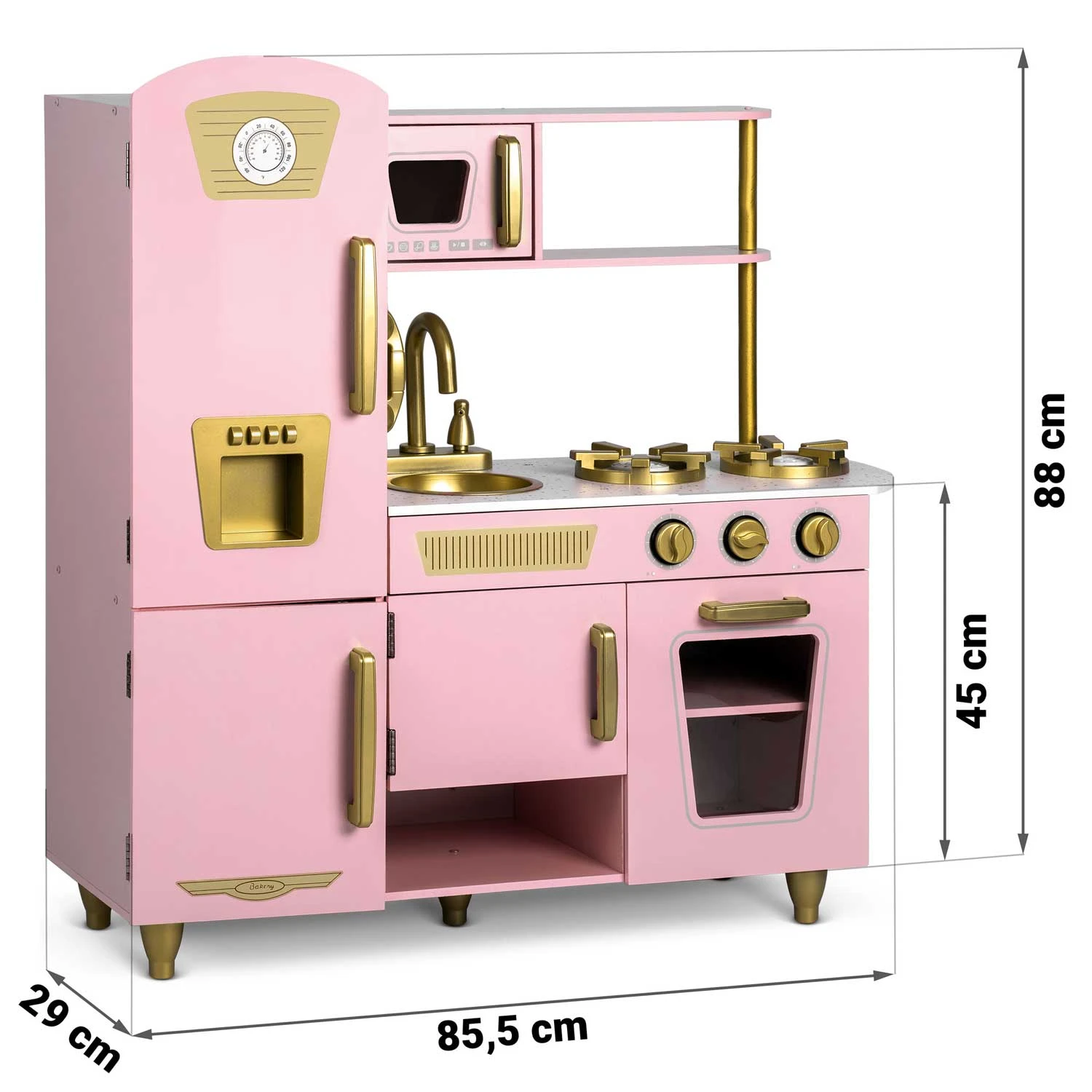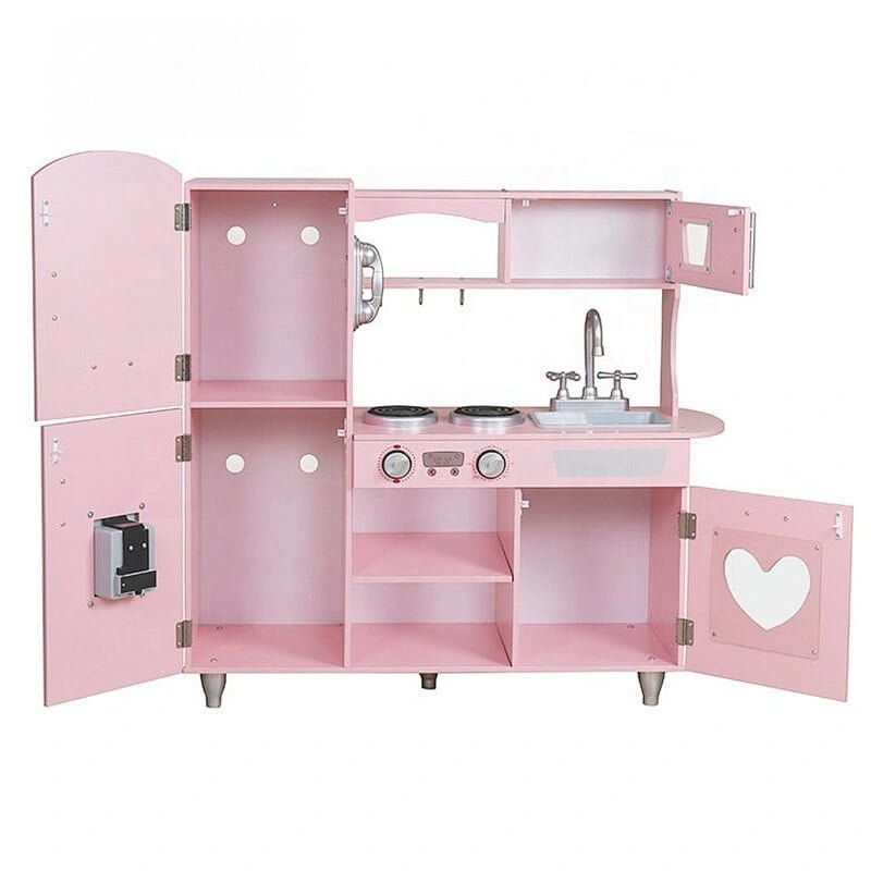Uporaba najboljših surovin za izdelavo kuhinje pomeni, da bo zdržala vrsto let . Debela plošča in noge so izdelane iz masivnega lesa . Preostali elementi so izdelani iz MDF-ja . Kuhinja je opremljena z vsem, kar potrebujete , vključno s premično pipo, pomivalnim koritom, policami, omarico, kliki, uro, mikrovalovno pečico in pralnim strojem z odpiralnimi vrati. Vsi leseni elementi so brez nevarnih robov.