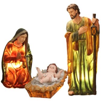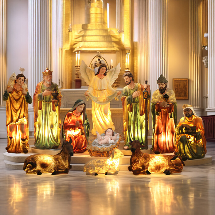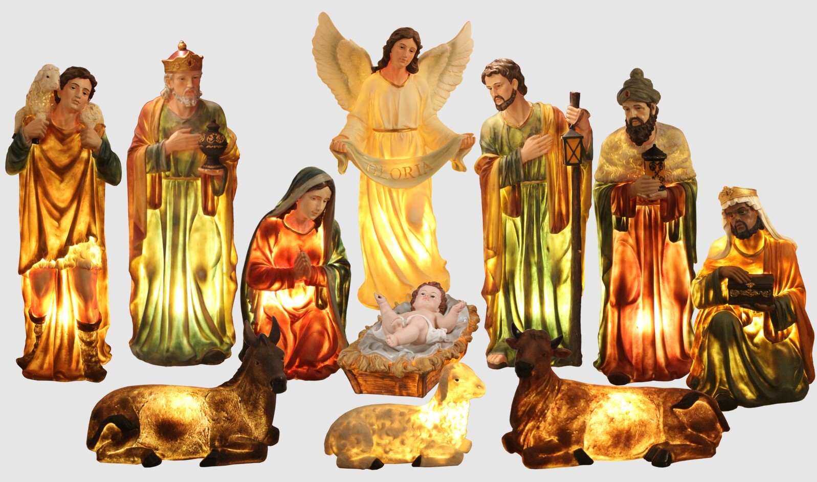 Ustvarite edinstveno in praznično božično vzdušje s tem kompletom 11 osvetljenih figur iz visokokakovostne epoksidne smole. Komplet vključuje vse najpomembnejše figure iz božičnega prizora: dojenčka Jezusa, Marijo, Jožefa, angele, tri kralje, pastirje in živali . Ta klasični komplet vam bo omogočil, da ustvarite čudovite in harmonične božične jaslice.