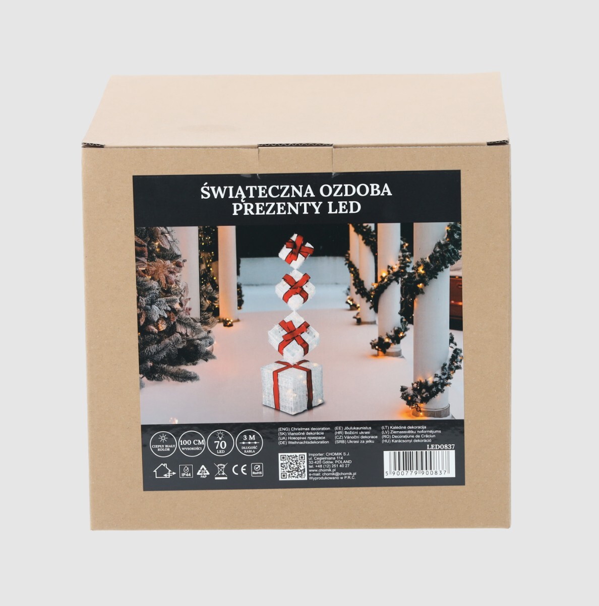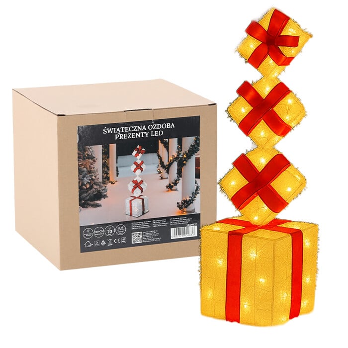 Ta osupljiva LED božična dekoracija, sestavljena iz štirih škatel različnih velikosti, je okrašena s 70 toplo belimi LED diodami, ki ustvarjajo prijetno in elegantno vzdušje. S skupno višino 100 cm je komplet idealen za okrasitev terase, vrta, izložbe ali dnevne sobe. Z zaščito IP44 je primeren za notranjo in zunanjo uporabo. Je popoln način, da svojim praznikom dodate kanček čarovnije.