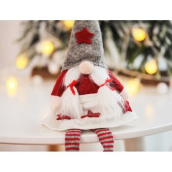 Božični škrat z visečimi nogami Napolnjen s plišem Za stabilizacijo stoječega položaja imajo v trupu pesek, ki jim doda dodatno težo Teža: 90 g Dimenzije: Največja višina: 32 cm Širina: 15 cm