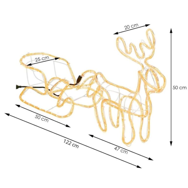 Dolžina kompleta: približno 122 cm Dolžina napajalnega kabla: 2 m Dolžina severnega jelena: približno 47 cm Širina rogovja: 20 cm Največja višina severnega jelena: do 50 cm Dolžina kabla, ki povezuje severnega jelena s sanmi: približno 65 cm Dolžina sani: približno 50 cm Največja širina sani: 25 cm Debelina kabla: 8,5 mm Notranji kabel: baker Število diod: 192 kosov Debelina okvirja: 3,5 mm Razred IP: IP44 Barva svetlobe: toplo bela Napajanje: elektrika Napajanje: 220-240V, 50/60 Hz Moč: 16W Napajanje LED: 1,8 – 3,6 V / 20mA