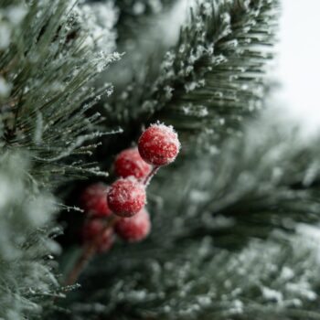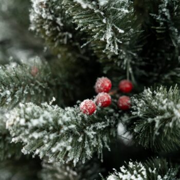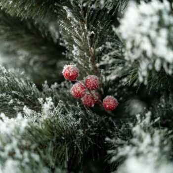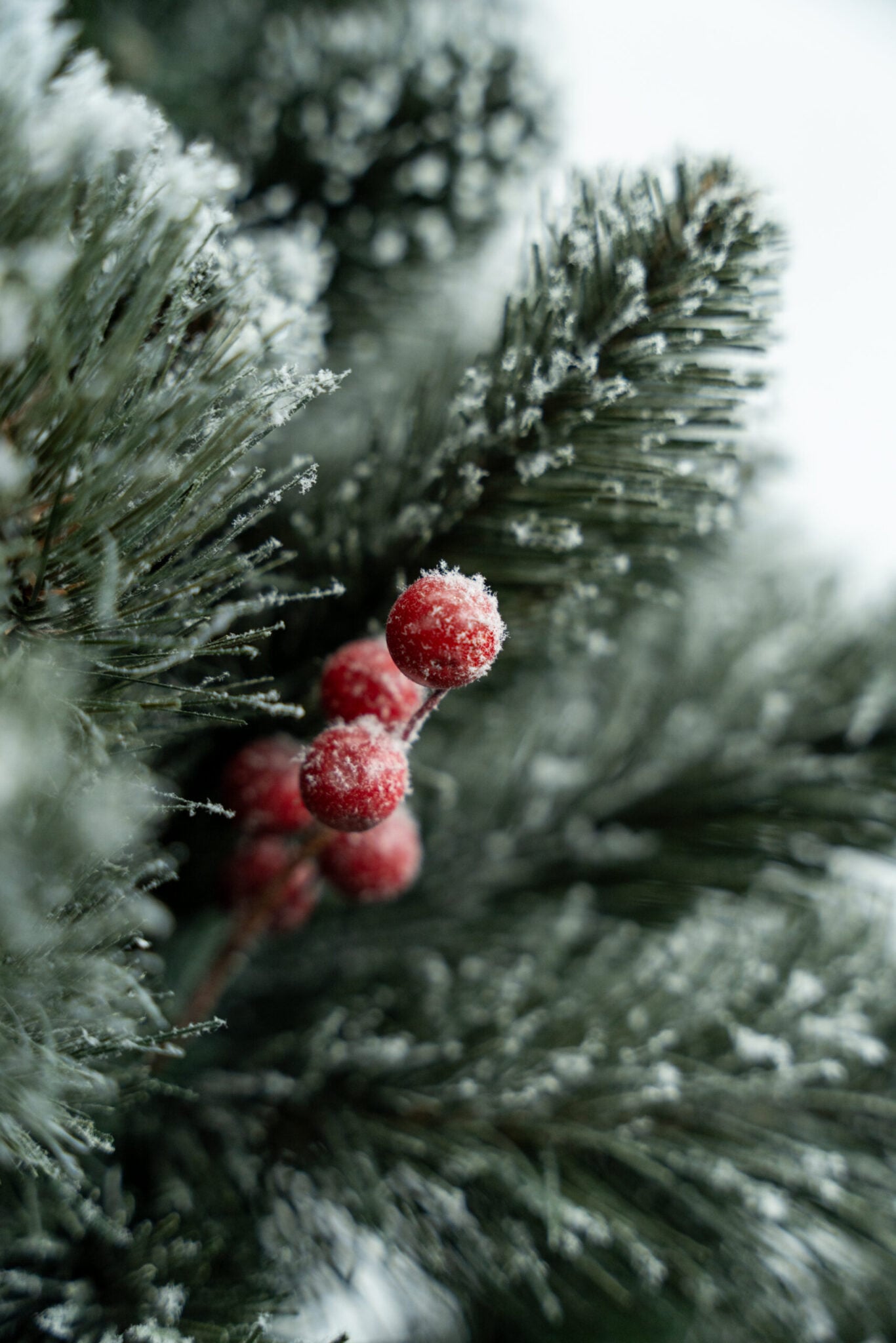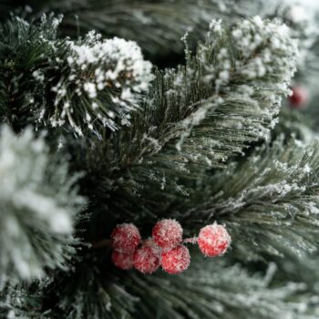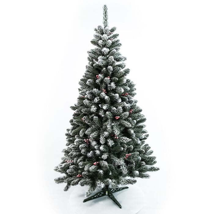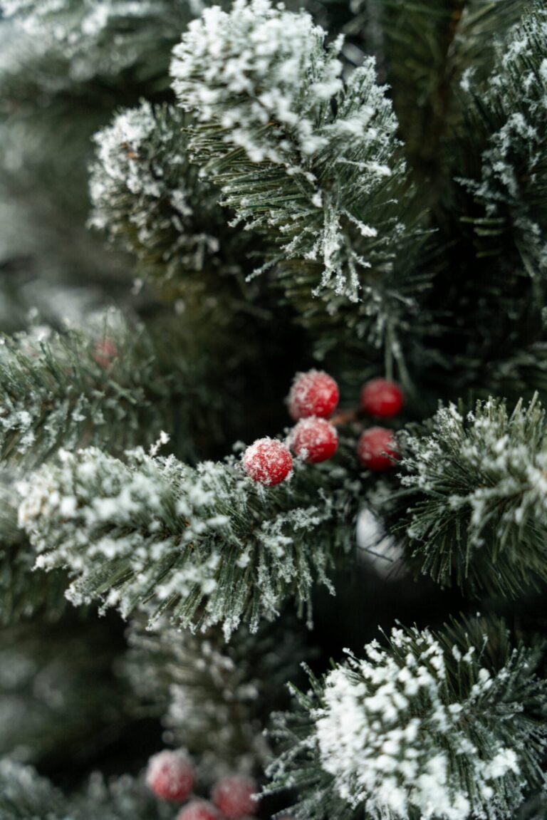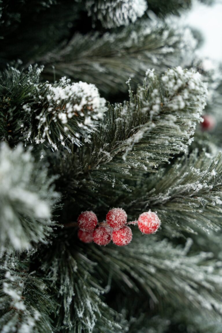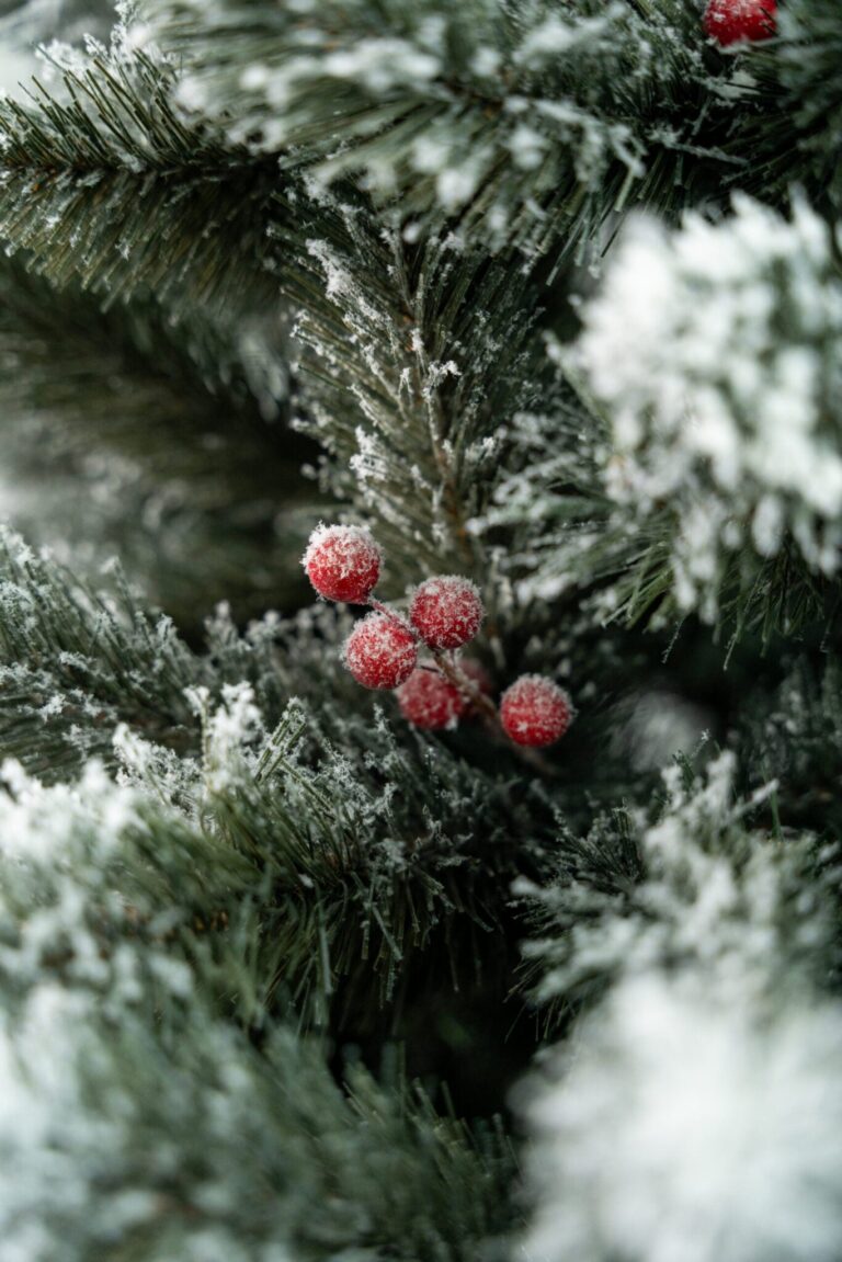 Veje z rdečimi jagodami so diskretno razporejene po celotni višini drevesa in ustvarjajo čudovit kontrast z belim snegom in zelenimi iglicami – božično drevo je videti “okrašeno” še pred kroglami in lučkami. -