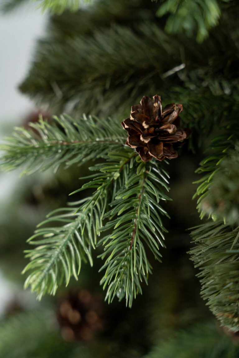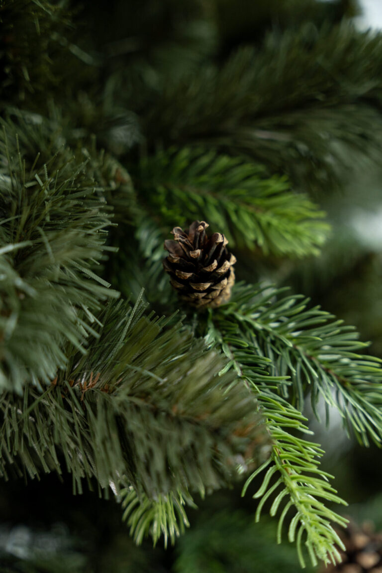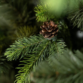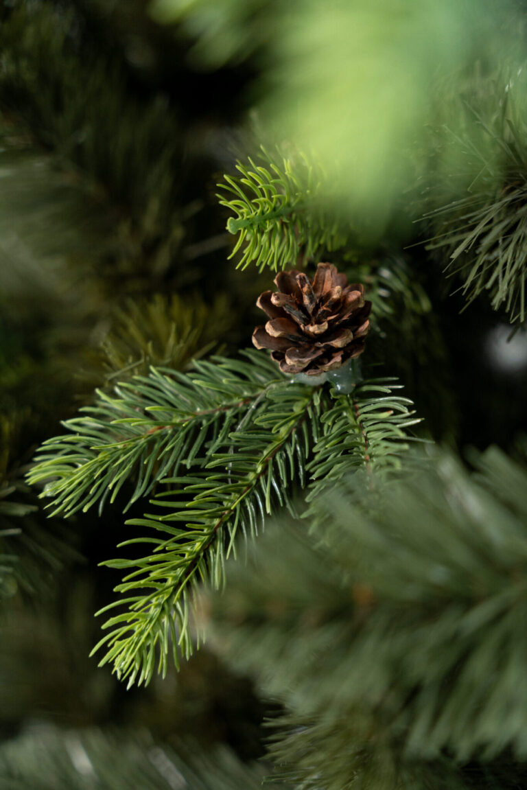 Goste veje različnih rezov (koničasti vrhovi + klasične veje) omogočajo, da se kroglice, trakovi in lučke odlično “usedejo” in ostanejo na svojem mestu. -