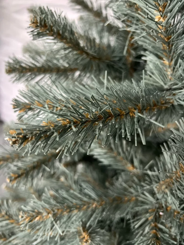 Smaragdno sive PVC iglice, dolge približno 3 cm, na glavnih vejah zagotavljajo prefinjen in sodoben videz.