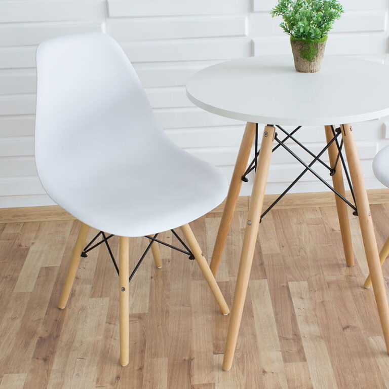 Miza: Barva zgornjega dela : bela Noge: bukov les Material zgornjega dela : MDF plošča Višina: 74 cm Plošča mize : 60 cm Stoli: Barva sedeža: bela Material sedeža: polipropilen Noge: bukev Dimenzije: 40 cm x 45 cm x 82 cm Teža: 2,5 kg