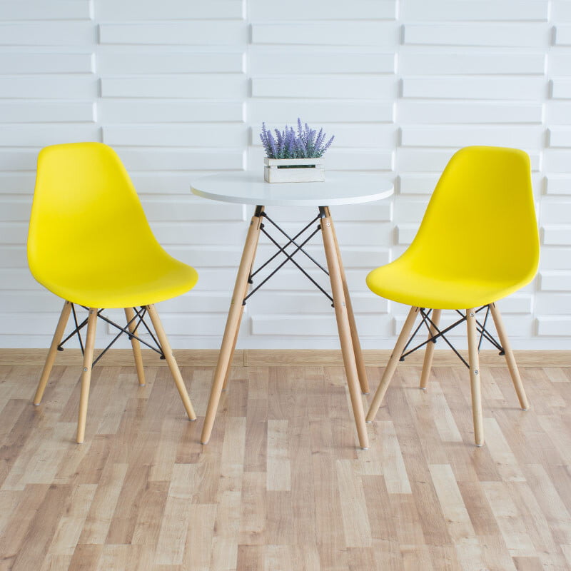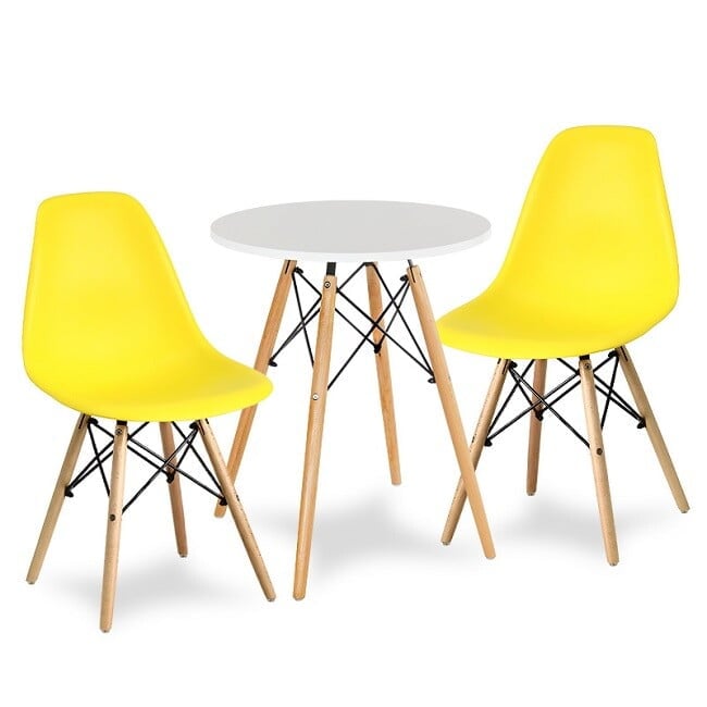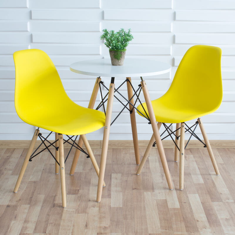 Miza: Barva zgornje plošče : bela Noge: bukov les Material zgornje plošče : MDF plošča Višina: 74 cm Plošče mize : 60 cm Stoli: Barva sedeža: rumena Material sedeža: polipropilen Noge: bukev Dimenzije: 40 cm x 45 cm x 82 cm Teža: 2,5 kg