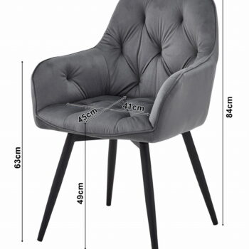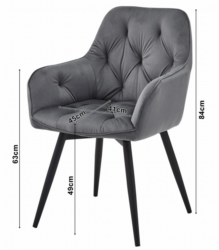 • Skupna višina: 84 cm • Višina naslona za roke: 63 cm • Višina sedeža: 49 cm • Skupna širina: 56 cm • Širina sedeža: 41 cm • Skupna globina: 61 cm • Globina sedeža: 45 cm