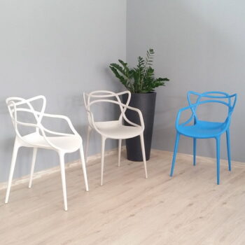 Edinstvenost stola temelji na igri polnih in praznih prostorov, ki jih ustvarja formalna kombinacija treh različnih naslonjalov, ki se prelivajo v obod sedeža.