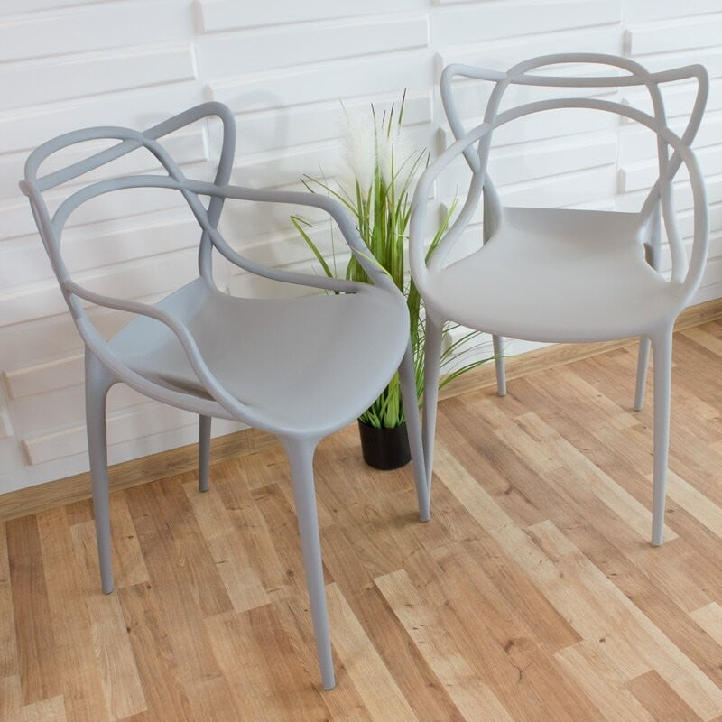 Edinstvenost stola temelji na igri polnih in praznih prostorov, ki jih ustvarja formalna kombinacija treh različnih naslonjalov, ki se prelivajo v obod sedeža.
