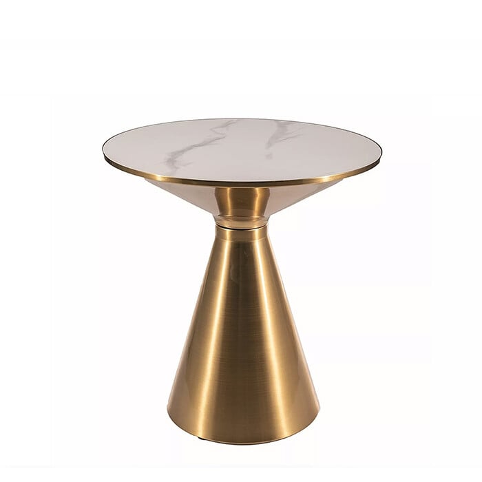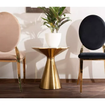 Klubska mizica Aries je eleganten in funkcionalen dodatek vaši dnevni sobi ali pisarni. Ima okroglo obliko, z belo keramično površino z marmornim učinkom, ki ji daje prefinjen videz. Zlata kovinska konstrukcija zagotavlja stabilnost in vzdržljivost. Ključne lastnosti: