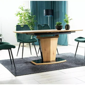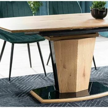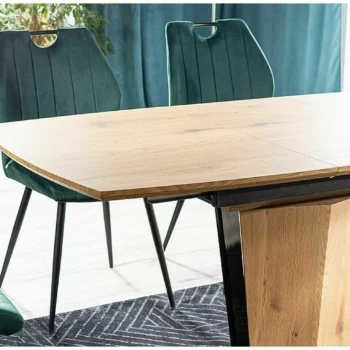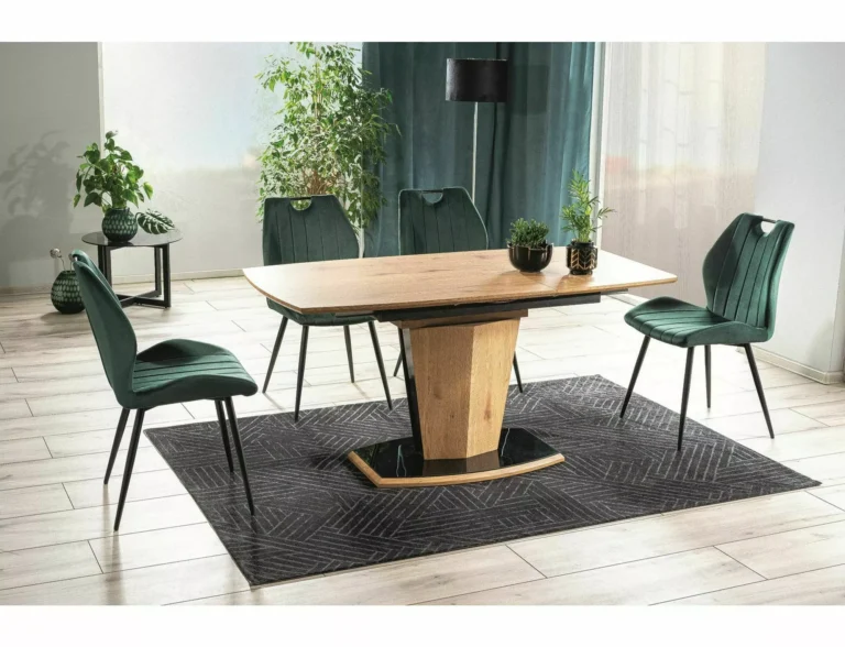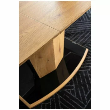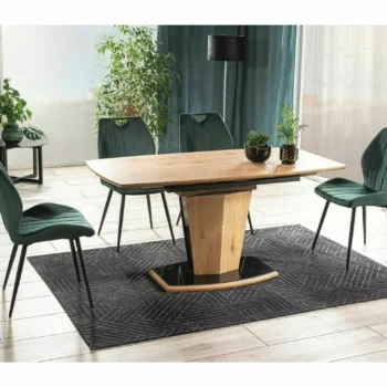 - Oblika: Kombinacija naravnega hrasta in črnega laka daje mizi sodoben in eleganten videz, idealen za moderne jedilnice.