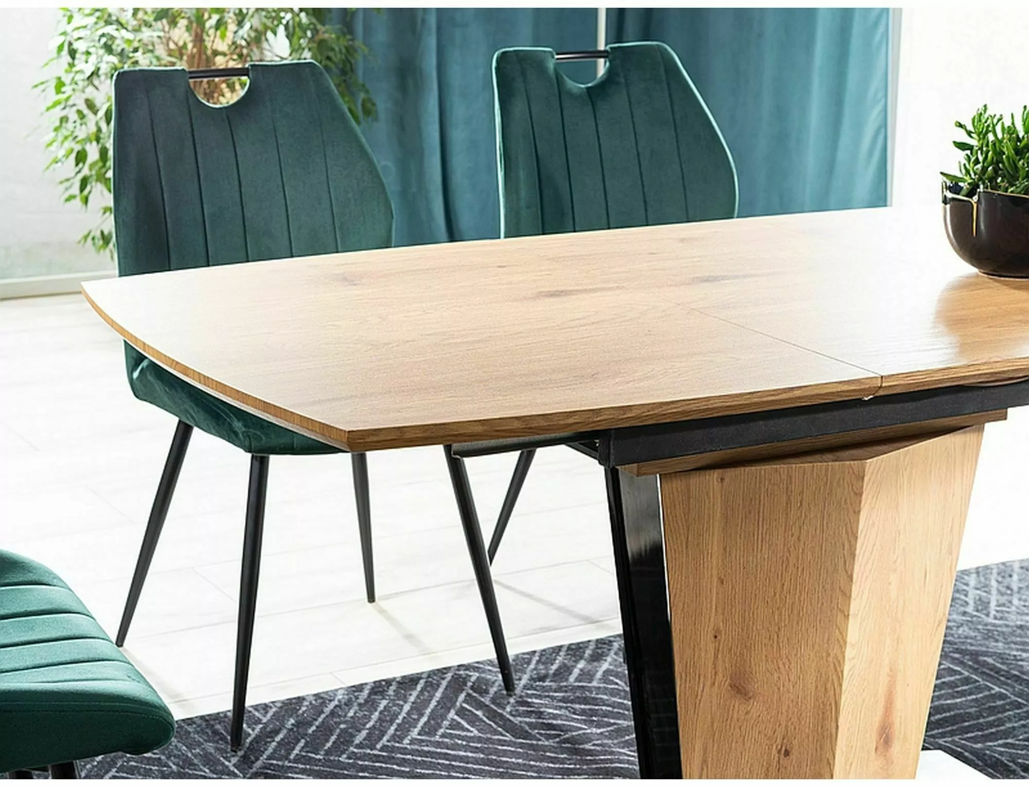 - Oblika: Kombinacija naravnega hrasta in črnega laka daje mizi sodoben in eleganten videz, idealen za moderne jedilnice.
