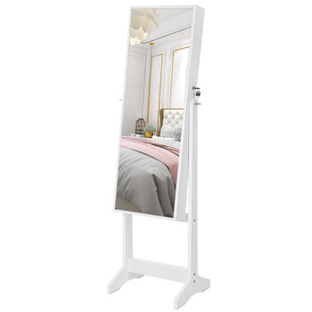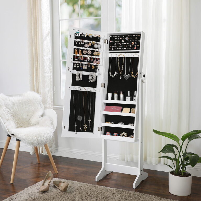 Predstavljamo elegantno in praktično belo samostoječo omarico za nakit z ogledalom , ki se bo odlično podala v vašo spalnico, garderobo ali dnevno sobo. Ta kos pohištva ne zagotavlja le funkcionalnosti, temveč vašemu prostoru doda tudi estetsko vrednost. Glavne značilnosti: