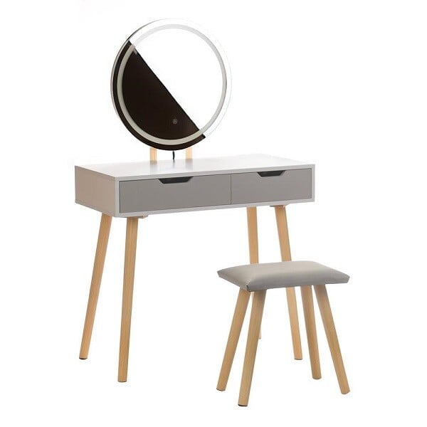 Značilnosti izdelka: Toaletna mizica v preprostem slogu v beli barvi. LED osvetlitev, vgrajena v ogledalo (več možnosti menjave barve). Dva predala. Stol v sivi barvi sedeža. Visoka funkcionalnost. Polmat plošča. Dimenzije: – Širina delovne plošče 80 cm, – Globina delovne plošče 40 cm, – Višina mizne plošče 74 cm, – Dimenzije ogledala: premer 50 cm, – Skupna višina 126 cm, – Notranje dimenzije predala: širina: 39 cm, – Notranje dimenzije predala: širina: 39 cm, – Dimenzije stola: višina: 43 cm, širina: 39 cm, globina: 24 cm, – Dimenzije embalaže: 89x59x27 cm, – Dolžina napajalnega kabla: 85 cm, teža: 22 kg