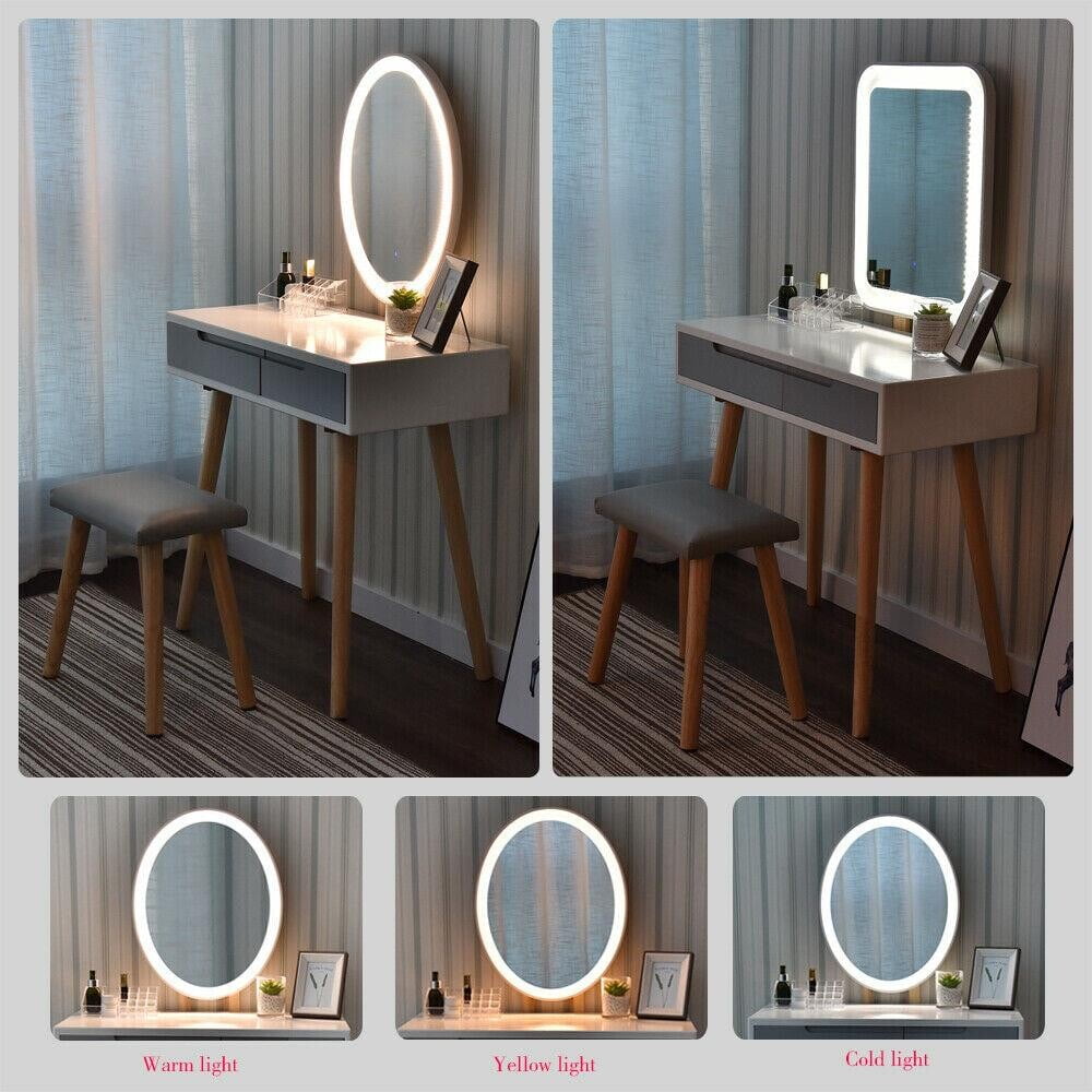 Značilnosti izdelka: Toaletna mizica v preprostem slogu v beli barvi. LED osvetlitev, vgrajena v ogledalo (več možnosti menjave barve). Dva predala. Stol v sivi barvi sedeža. Visoka funkcionalnost. Polmat plošča. Dimenzije: – Širina delovne plošče 80 cm, – Globina delovne plošče 40 cm, – Višina mizne plošče 74 cm, – Dimenzije ogledala: premer 50 cm, – Skupna višina 126 cm, – Notranje dimenzije predala: širina: 39 cm, – Notranje dimenzije predala: širina: 39 cm, – Dimenzije stola: višina: 43 cm, širina: 39 cm, globina: 24 cm, – Dimenzije embalaže: 89x59x27 cm, – Dolžina napajalnega kabla: 85 cm, teža: 22 kg