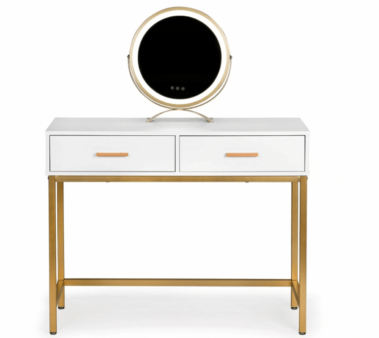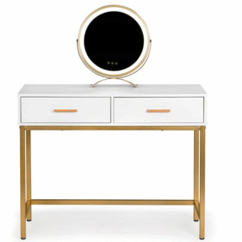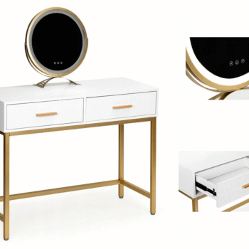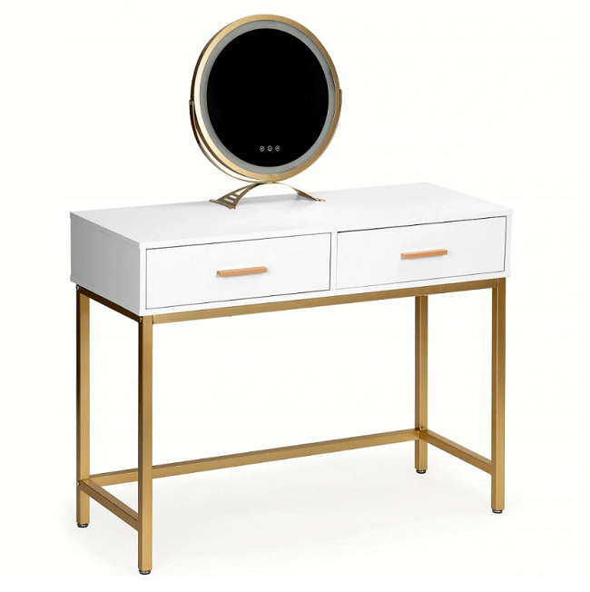 Čudovita toaletna mizica za profesionalno in ljubiteljsko uporabo za damo, ki ceni udobje in eleganco v svojem domu. Izdelana s pozornostjo do vsake, tudi najmanjše podrobnosti. Je kombinacija stila in brezčasne elegance. Popolnoma se prilega vsaki ureditvi. Zahvaljujoč svojemu videzu bo očarljiv dodatek k številnim notranjim prostorom. Toaletna mizica ima okroglo premično ogledalo z LED osvetlitvijo z možnostjo spreminjanja barv. Vključeno: