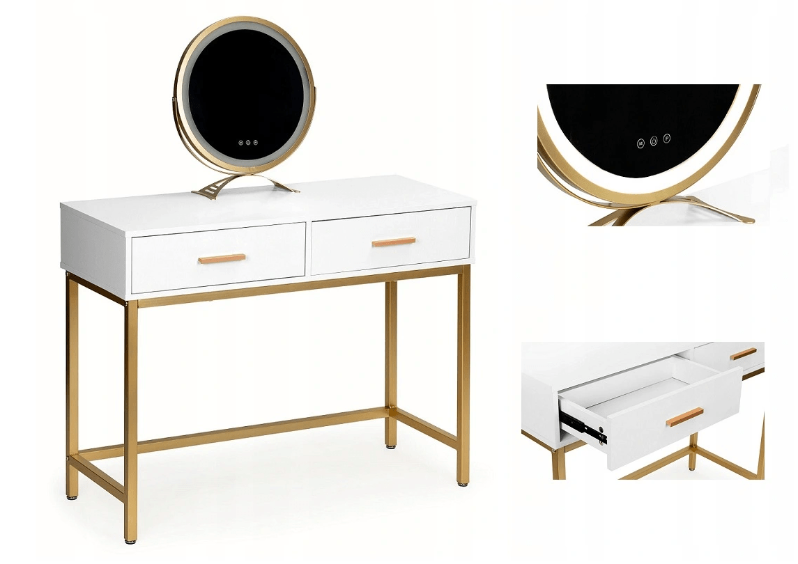 Čudovita toaletna mizica za profesionalno in ljubiteljsko uporabo za damo, ki ceni udobje in eleganco v svojem domu. Izdelana s pozornostjo do vsake, tudi najmanjše podrobnosti. Je kombinacija stila in brezčasne elegance. Popolnoma se prilega vsaki ureditvi. Zahvaljujoč svojemu videzu bo očarljiv dodatek k številnim notranjim prostorom. Toaletna mizica ima okroglo premično ogledalo z LED osvetlitvijo z možnostjo spreminjanja barv. Vključeno: