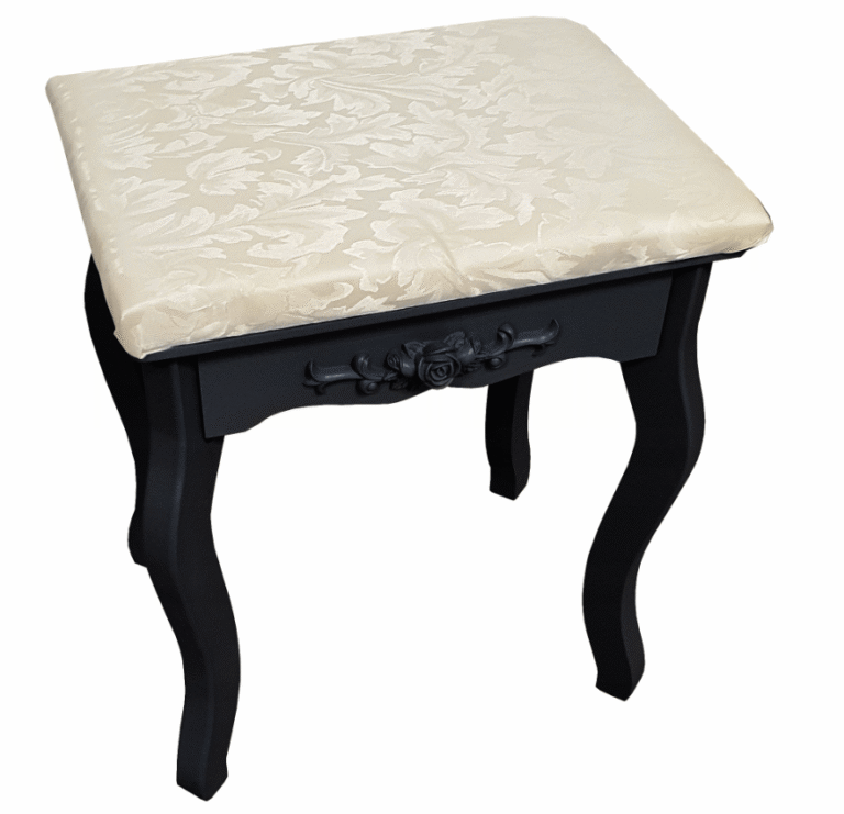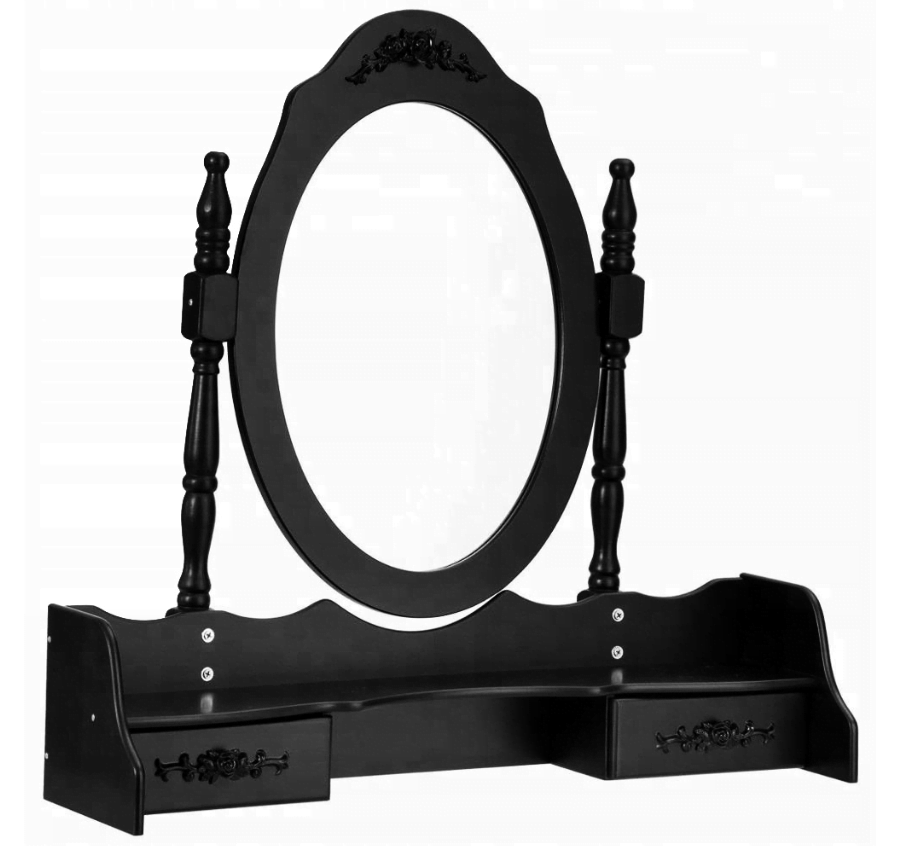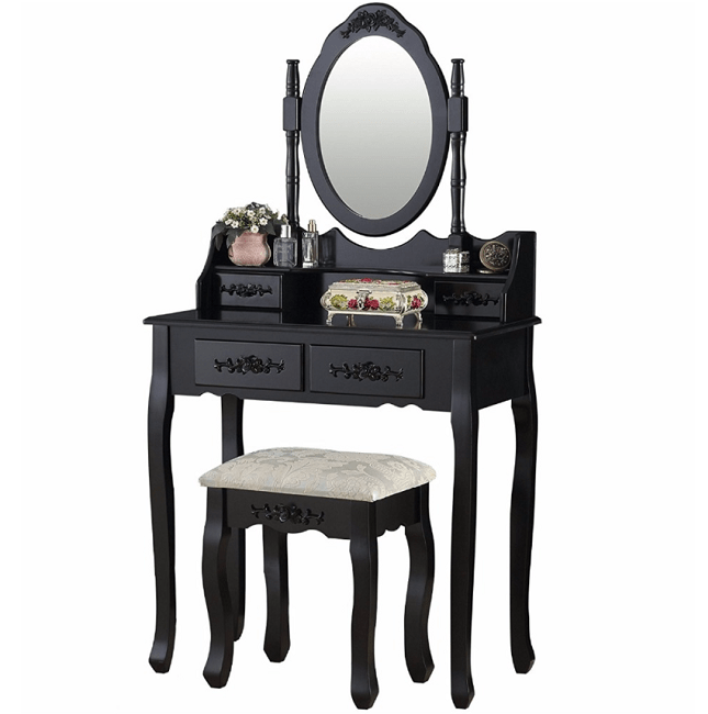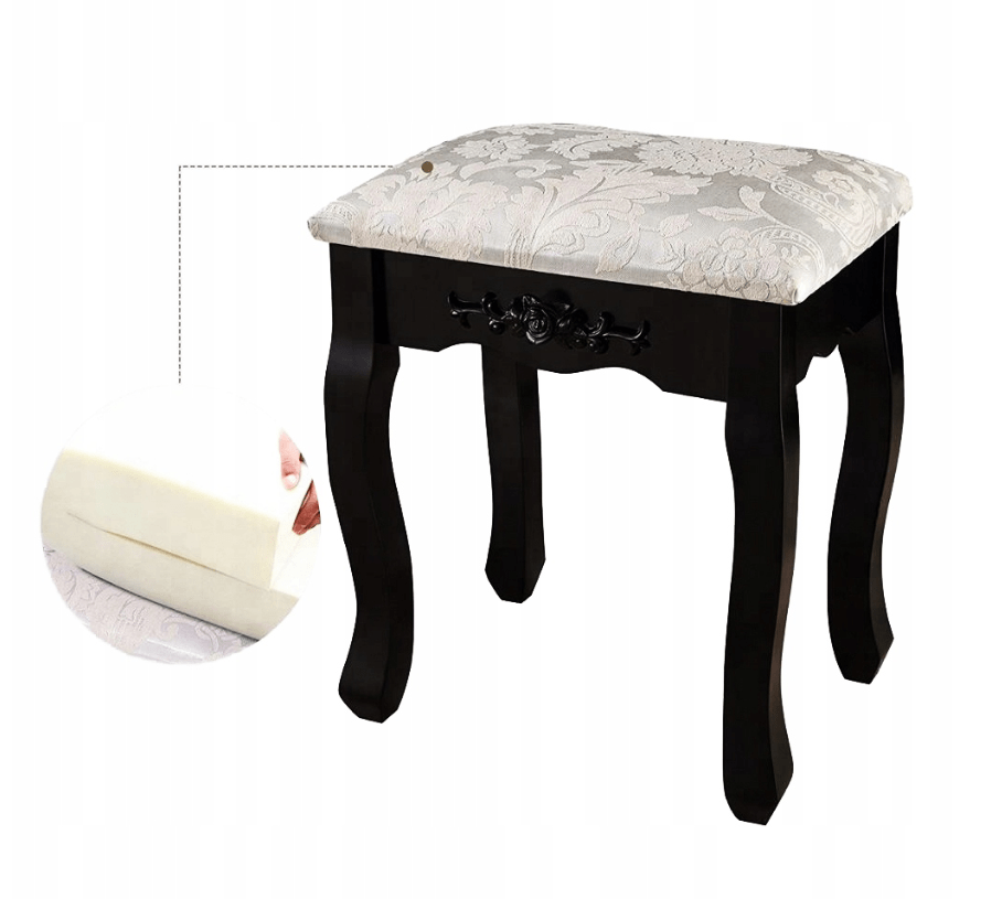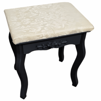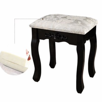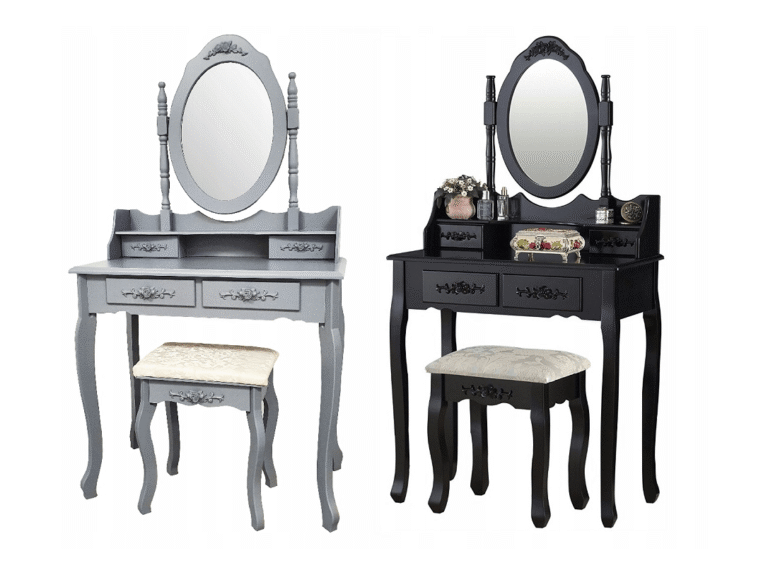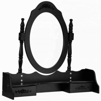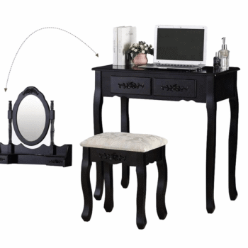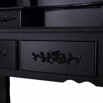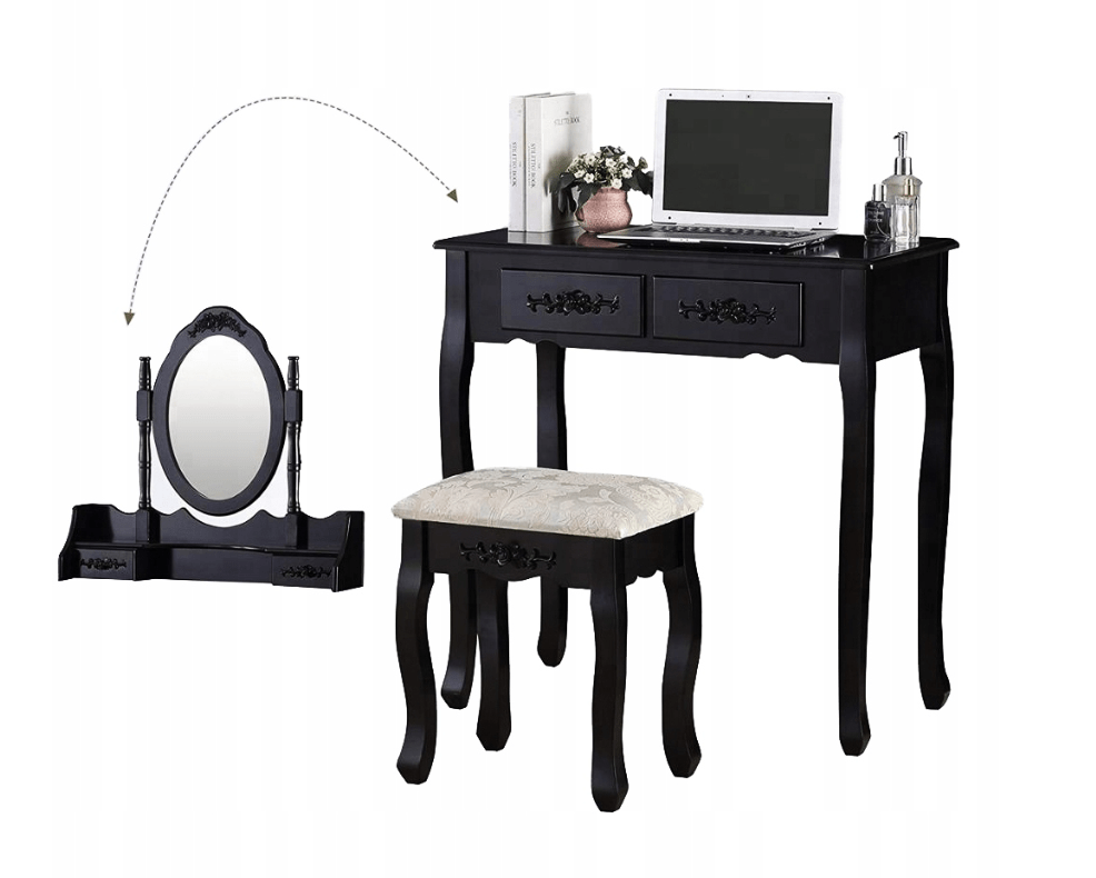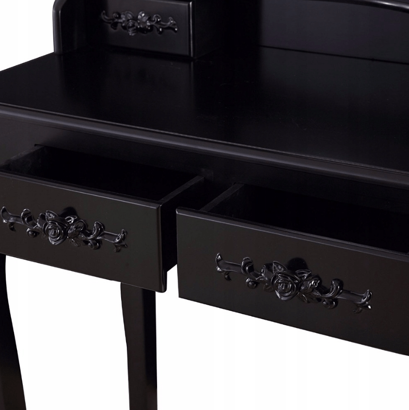 – Toaletna mizica v elegantnem črnem slogu, – Zaobljene oblike in čudoviti okraski ji dajejo privlačen videz, – 4 predali ponujajo veliko prostora za kozmetiko, – Veliko lepo ogledalo, – Udoben stol z romantičnim vzorcem, – Visoka funkcionalnost. Dimenzije: – Širina mize 74 cm, – Globina mize 40 cm, – Višina mize do ogledala 75 cm, – Visoka višina z ogledalom 67 cm, – Skupna višina 142 cm, – Notranje dimenzije predala: 2x 23x26x6 cm 2x 13×6,5×4,5 cm, – Velikost stola: 44 cm, širina: 39 cm, globina: 28 cm, Potrebna je montaža. Toaletna mizica je opremljena s priborom/setom za samostojno montažo. Material: MDF/steklo