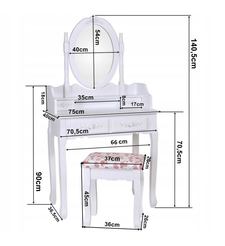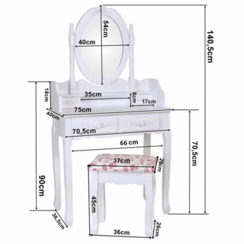 Toaletna mizica LISA izdelana v slogu Shabby Chic Komplet vključuje udoben stol ✅ CE certifikat Dimenzije: 74 cm dolžina x 142 cm višina x 40 cm globina
