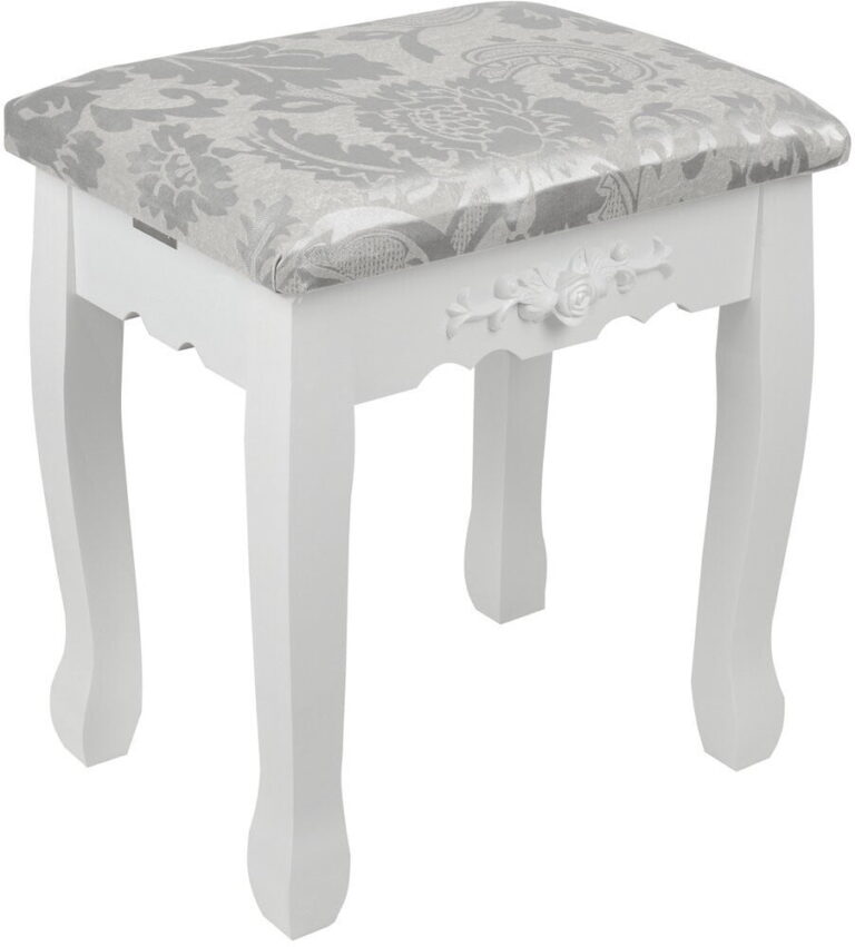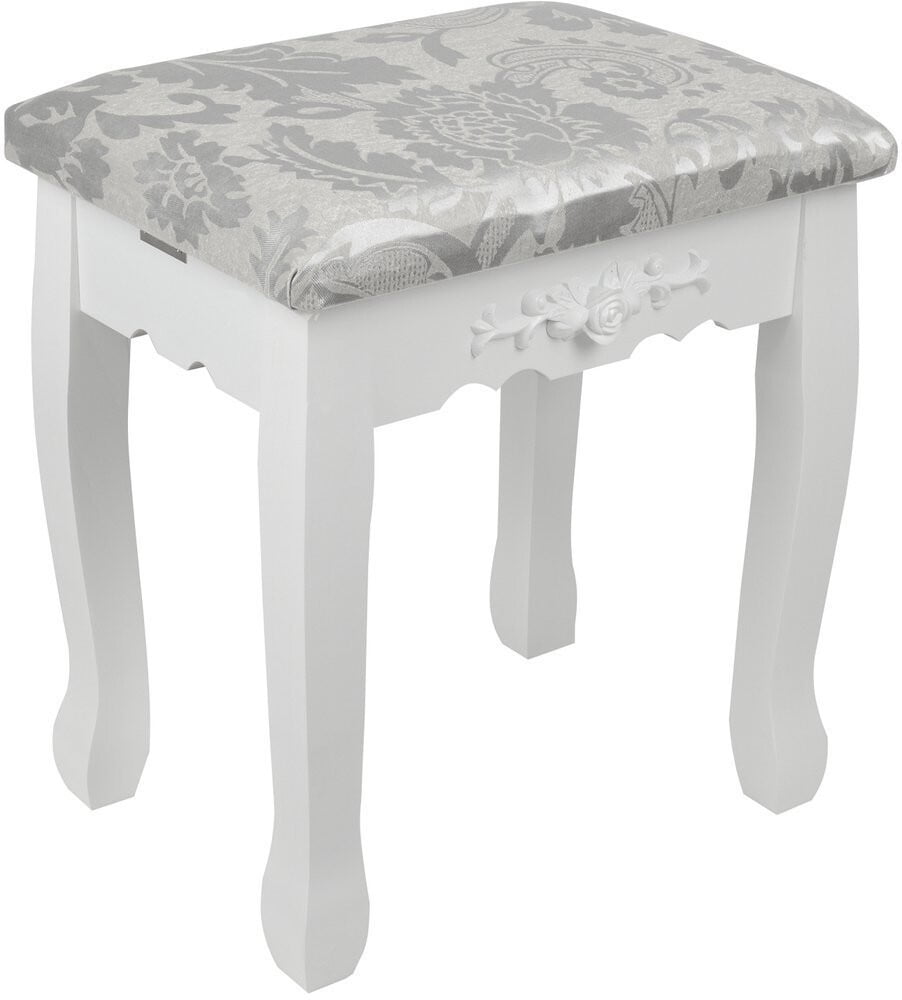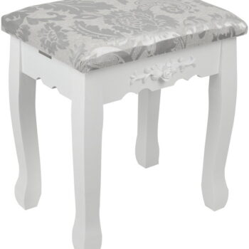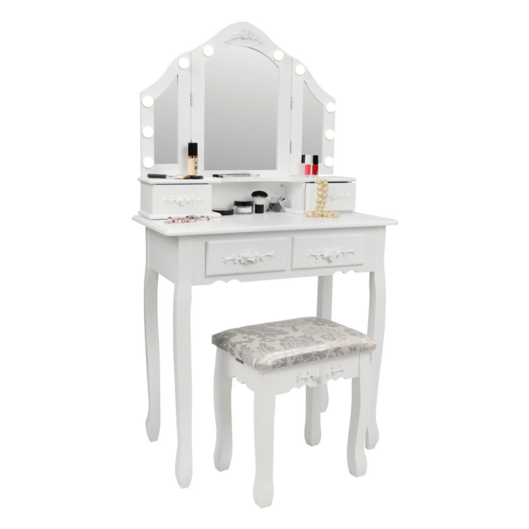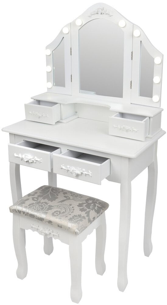 Toaletna mizica Mardot, izdelana v slogu Shabby Chic. Komplet vključuje tudi udoben stol. Ogledala z vgrajeno osvetlitvijo z 10 LED žarnicami. ✅ CE certifikat . Dimenzije: dolžina 75 cm x višina 140 cm x globina 40 cm.