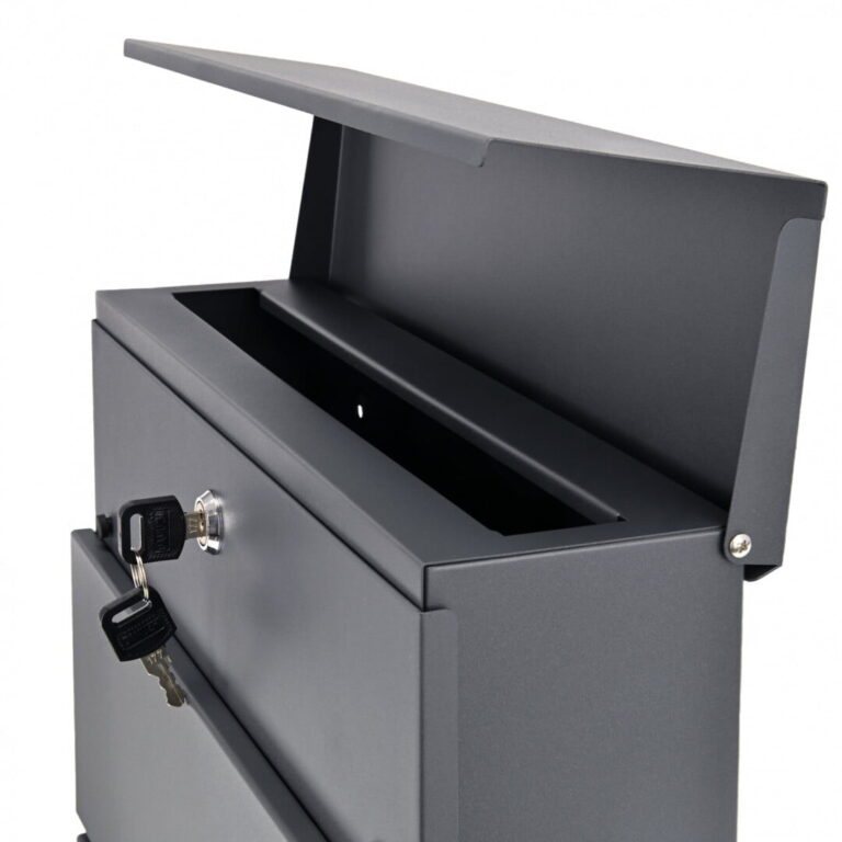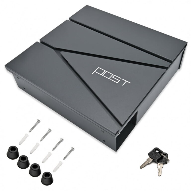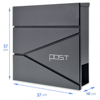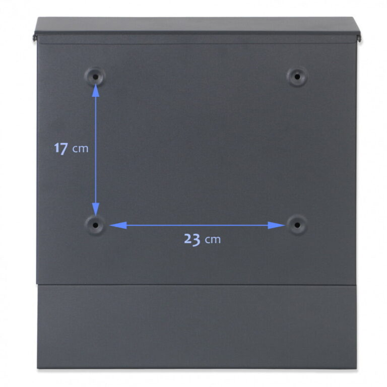 Dimenzije: 37 (višina) x 37 (širina) x 10,5 (globina) cm Dimenzije odprtine: 33 (dolžina) x 3 (širina) cm ️Vodoodporno ️Pocinkano jeklo – antracitna barva ️Držalo za časopise in letake