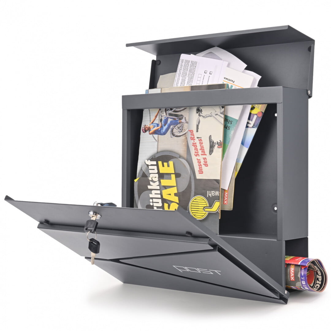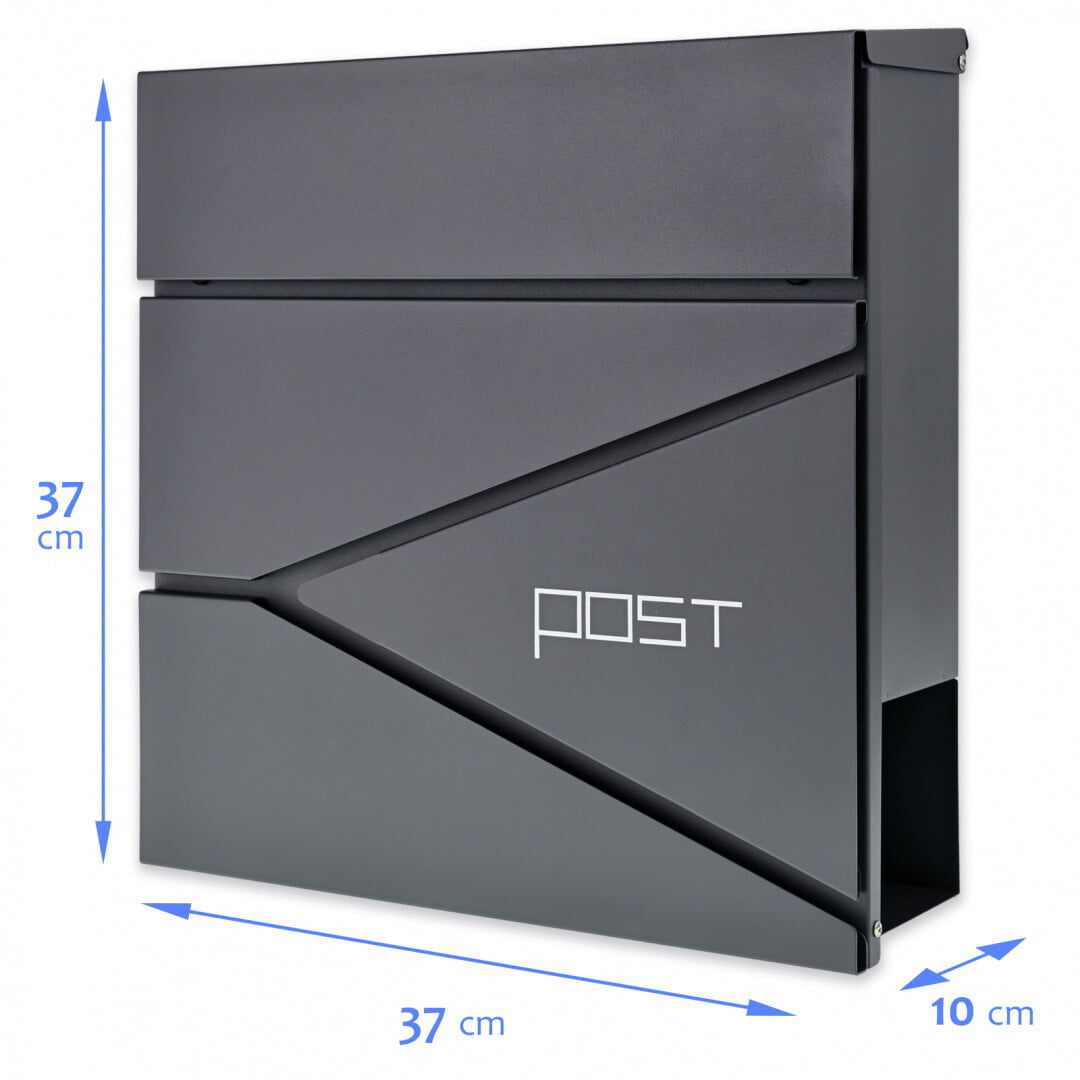 Dimenzije: 37 (višina) x 37 (širina) x 10,5 (globina) cm Dimenzije odprtine: 33 (dolžina) x 3 (širina) cm ️Vodoodporno ️Pocinkano jeklo – antracitna barva ️Držalo za časopise in letake
