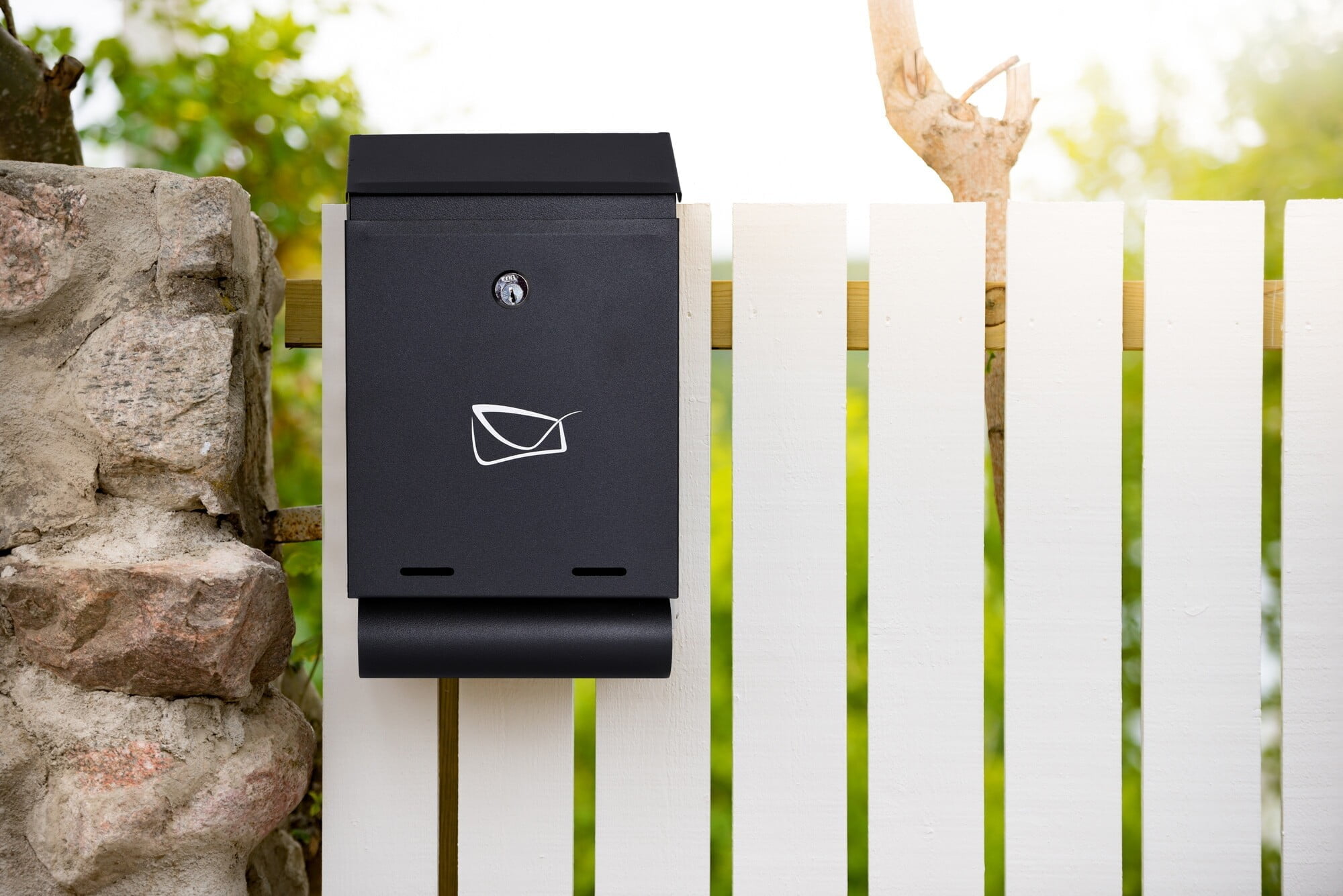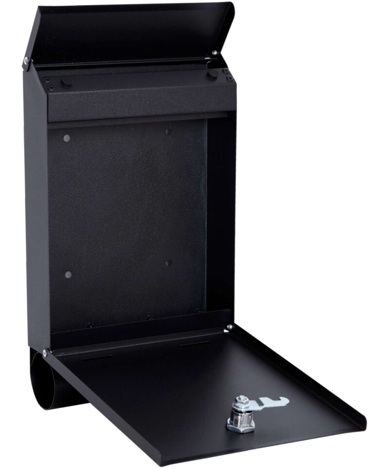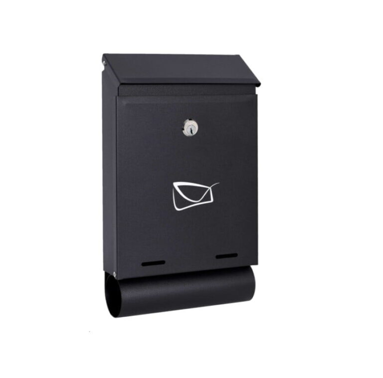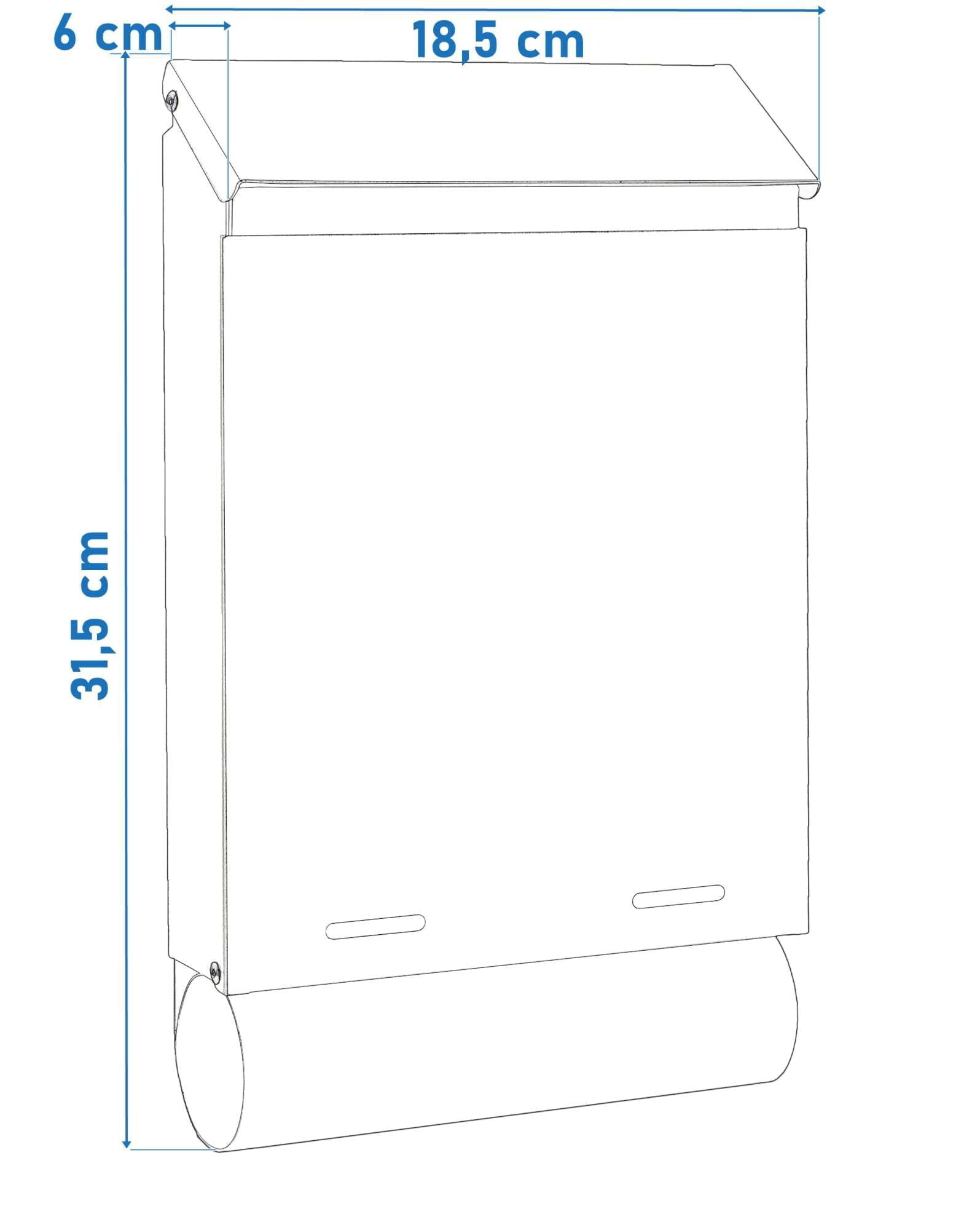 Dimenzije: 33 (višina) x 18,5 (širina) x 6 (globina) cm Dimenzije odprtine: 18 (dolžina) x 3 (širina) cm ️Vodoodporno ️Pocinkano jeklo – črna barva ️Držalo za časopise in letake ️2 ključa, komplet za montažo