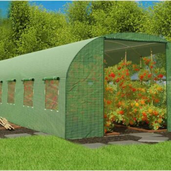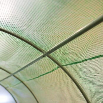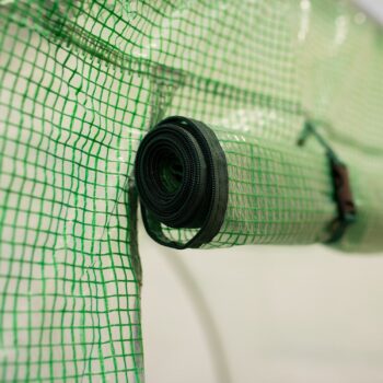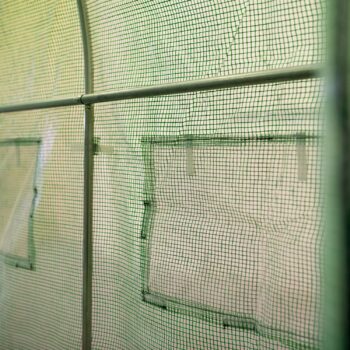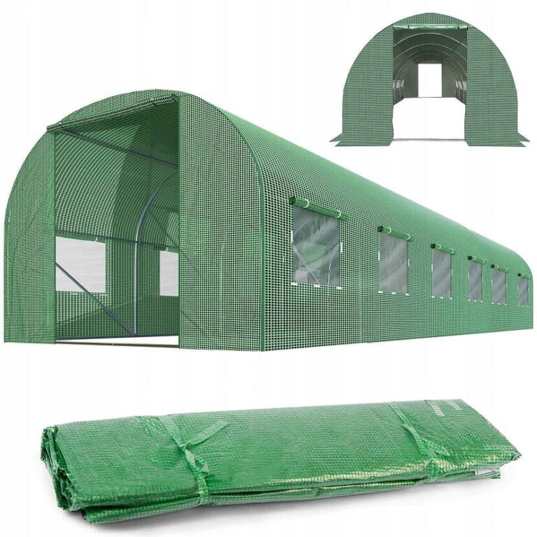 Folija za VRTNI RASTLINJAK 18m2 dimenzije: 6m x 3m x 2m, teža premaza: 140 g/m2 – zagotavlja vzdržljivost skozi vse letne čase, odpiranje z zadrgo, jekleni profili, pocinkani na obeh straneh 25 x 0,7 mm. ima zaščitno funkcijo za rastline, enostavna namestitev omogoča vzdrževanje optimalnih pogojev za rastline, zlasti v obdobjih nizkih temperatur ali oblačnosti, npr. zgodnje sorte zelenjave. Okna z mrežo proti komarjem, tunel ima 12 oken, 6 na vsaki stranski steni, skozi okna prodre večja količina sončne svetlobe, okna omogočajo nadzor nad pridelkom, ne da bi jih odprli in vstopili v vrtni tunel, okna so zaščitena z mrežo proti komarjem. Plastični pokrov iz folije je izdelan iz PE materiala s težo 140 g/m2 – zaradi tega so rastline dobro zaščitene pred vetrom in drugimi zunanjimi dejavniki, nizek koeficient odboja svetlobe zagotavlja visoko prepustnost sončnega sevanja!, zahvaljujoč lastnostim materiala ovoja se lahko opaž ustrezno raztegne in prilagodi, poleg tega pa je predor v spodnjem delu zaključen z “predpasnikom”, ki po prekrivanju z zemljo ščiti folijo pred zvijanjem, folije se odpirajo z zadrgo. PE folija 140 g/m2, odporna na UV4, zelen vhod z zadrgo