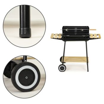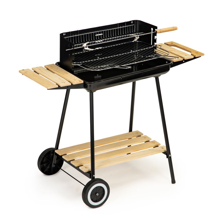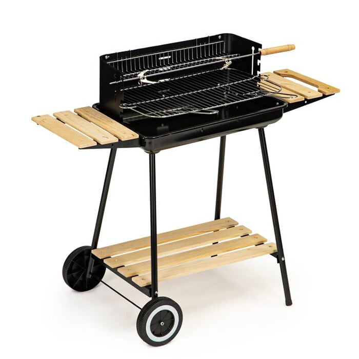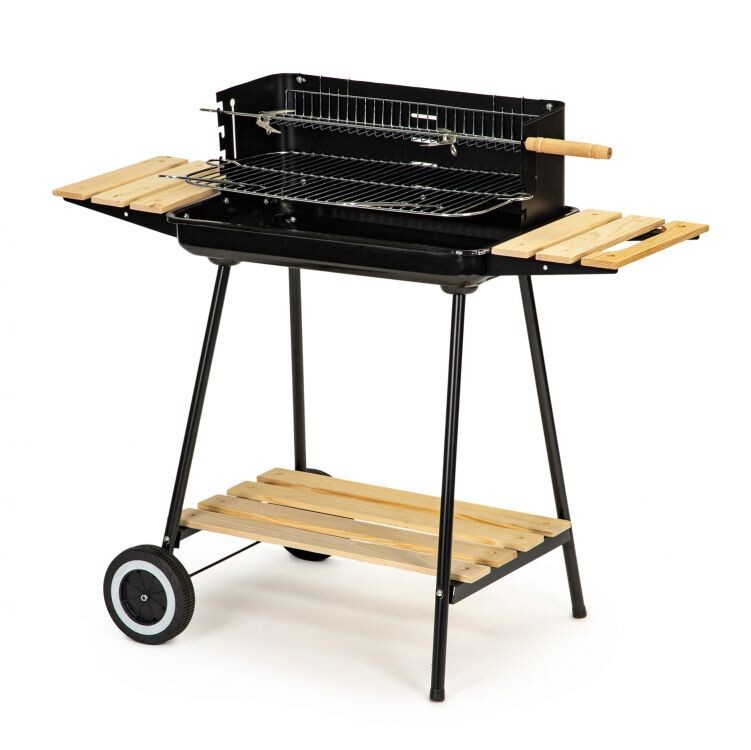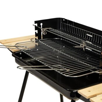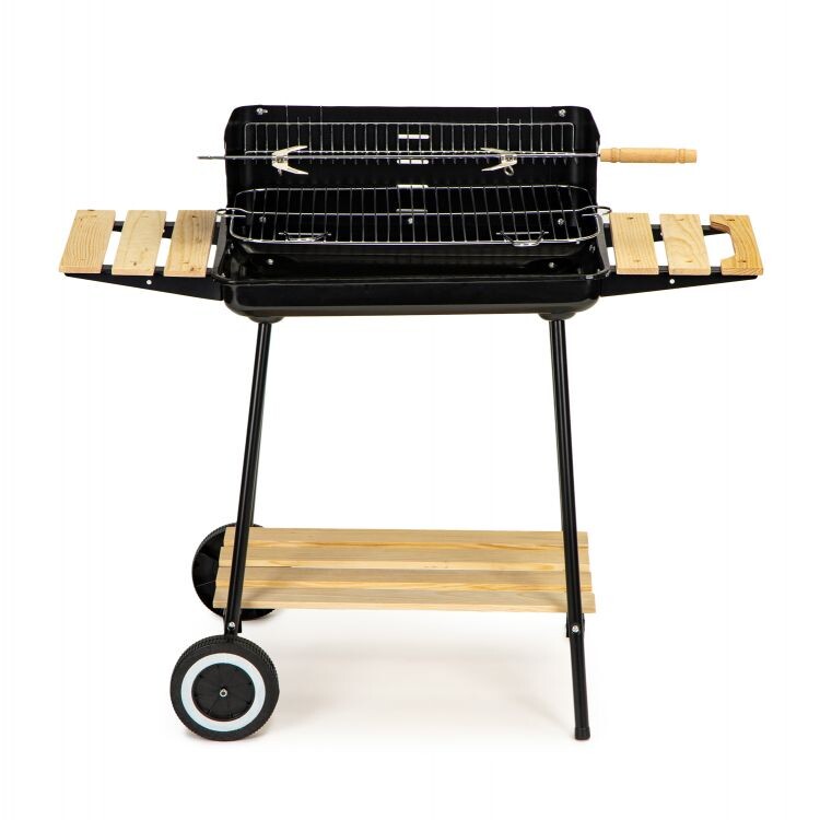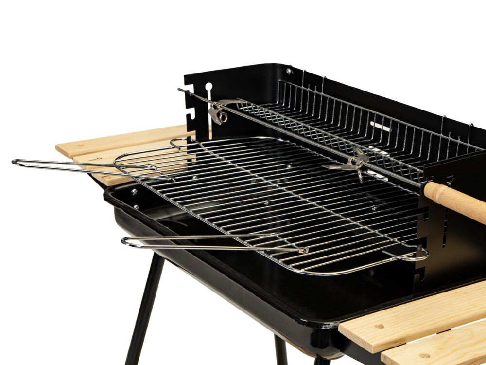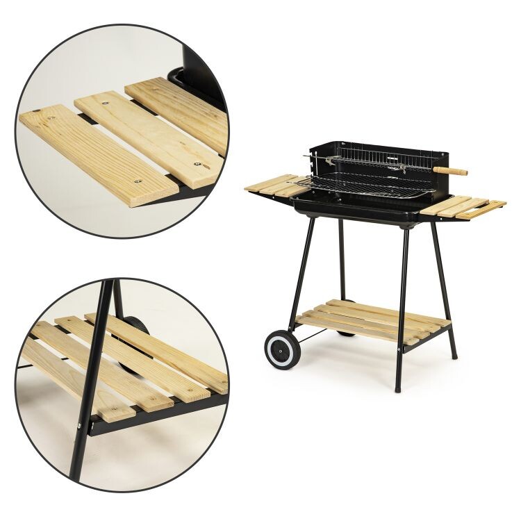 Žar ima stabilno kovinsko konstrukcijo , ki zagotavlja varnost pri pripravi obrokov. Žar je enostaven za prenašanje, tudi ko je vroč, saj ima dve vgrajeni kolesci in lesen ročaj . Lesene police vam omogočajo, da imate vse potrebne pripomočke pri roki. Veliko površino za žar zagotavlja kromirana rešetka dimenzij 52×32 cm .