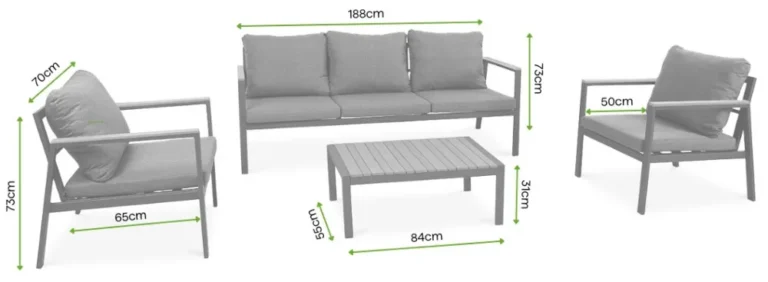 | Trisedežni | Š 188 cm × D 65 cm (50 cm z vzglavnikom) × V 73 cm |