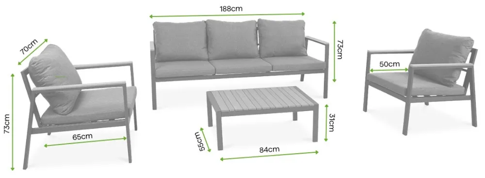 | Trisedežni | Š 188 cm × D 65 cm (50 cm z vzglavnikom) × V 73 cm |
