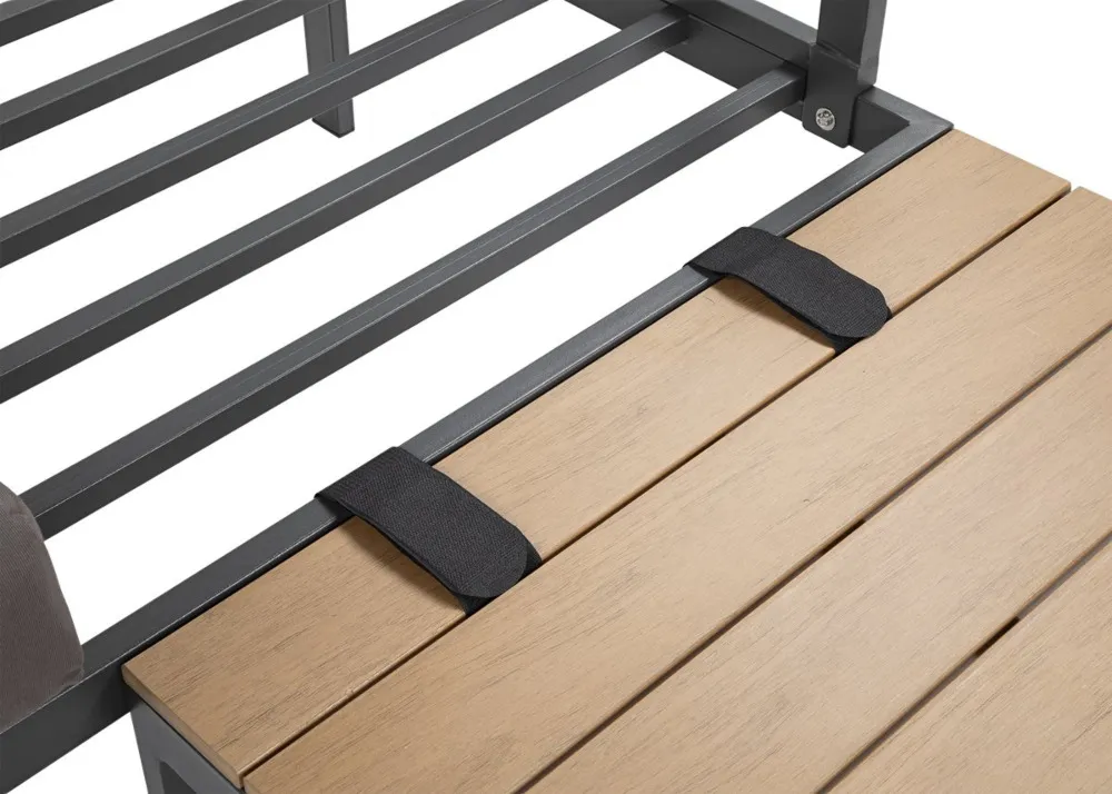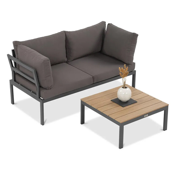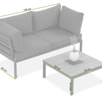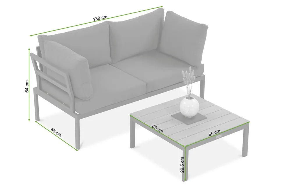 Komplet je sestavljen iz dvoseda in klubske mizice, ki se po potrebi spremeni v podaljšek za kotni kavč – idealno za sproščujoče sproščanje ali dodatno sedenje. -