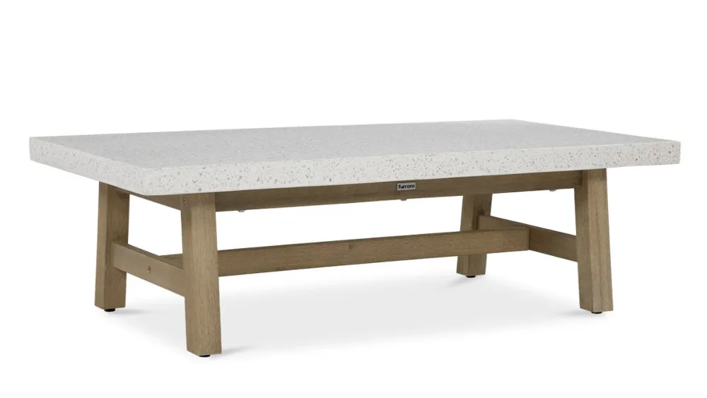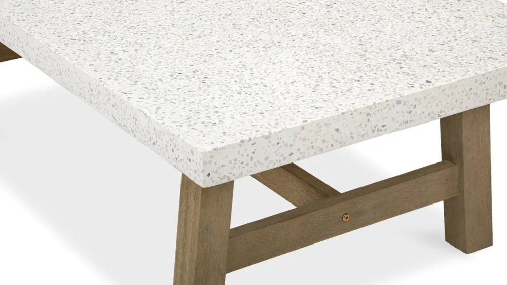 Nizko podnožje in široka teraco plošča ustvarjata eleganten kotiček za jutranjo kavo ali večerne koktajle.