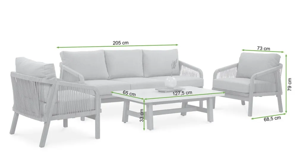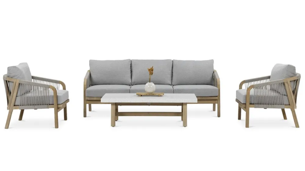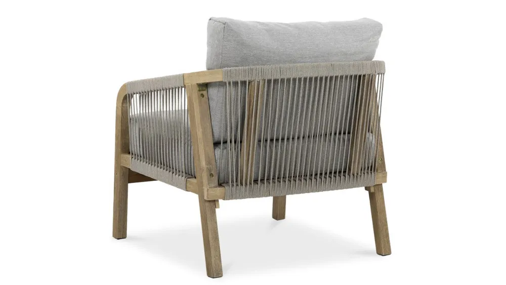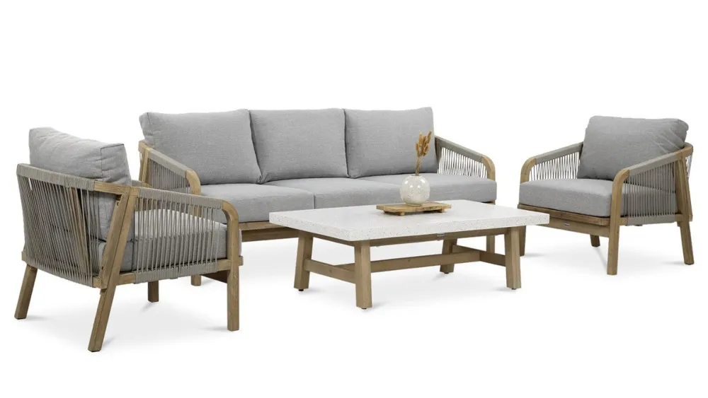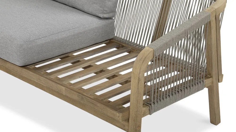 Nežen kontrast dimljeno belega lesa in blazin, odpornih na UV-žarke in umazanijo, zagotavlja prefinjeno udobje.